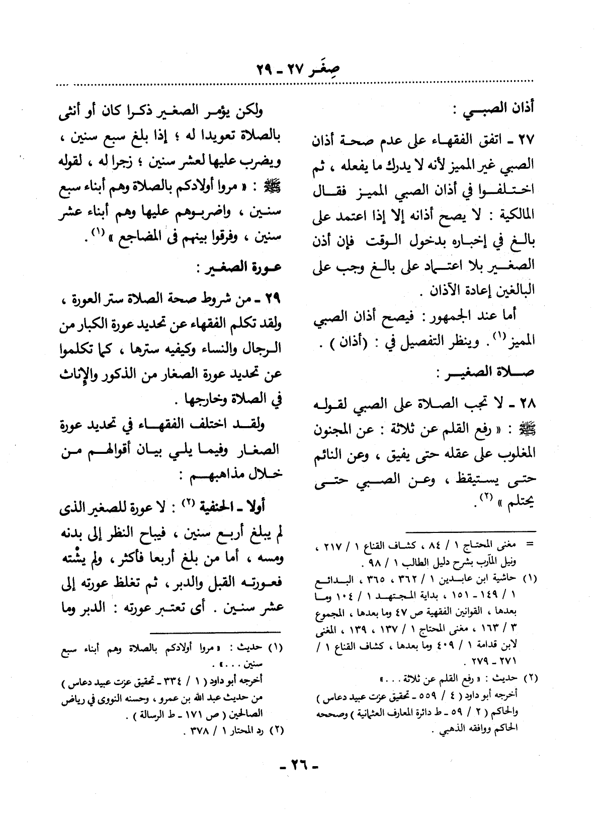 28 - لاَ تَجِبُ الصَّلاَةُ عَلَى الصَّبِيِّ لِقَوْلِهِ صَلَّى اللَّهُ عَلَيْهِ وَسَلَّمَ: رُفِعَ الْقَلَمُ عَنْ ثَلاَثَةٍ: عَنِ الْمَجْنُونِ الْمَغْلُوبِ عَلَى عَقْلِهِ حَتَّى يُفِيقَ، وَعَنِ النَّائِمِ حَتَّى يَسْتَيْقِظَ، وَعَنِ الصَّبِيِّ حَتَّى يَحْتَلِمَ (2) .