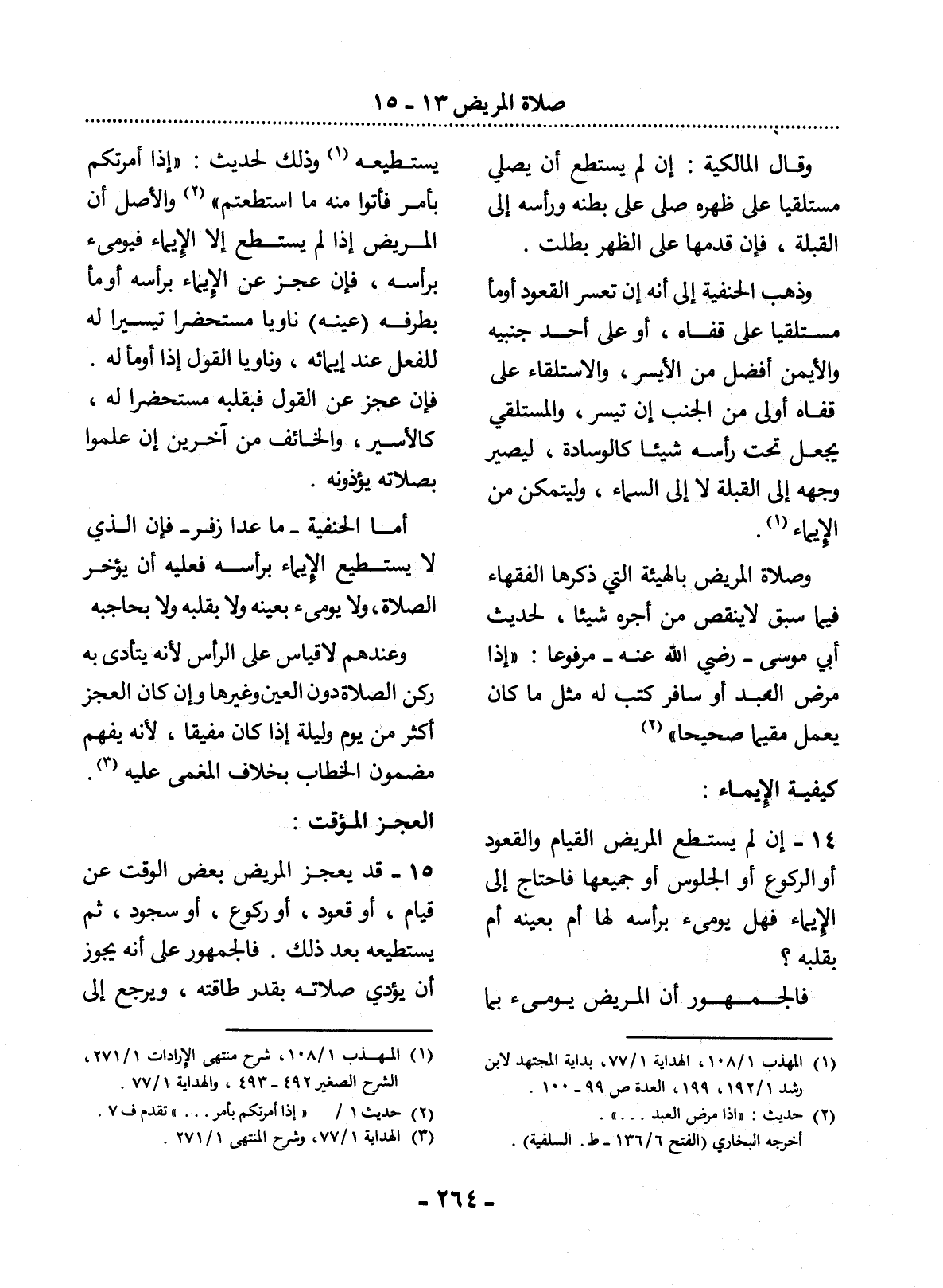 15 - قَدْ يَعْجِزُ الْمَرِيضُ بَعْضَ الْوَقْتِ عَنْ قِيَامٍ، أَوْ قُعُودٍ، أَوْ رُكُوعٍ، أَوْ سُجُودٍ، ثُمَّ يَسْتَطِيعُهُ بَعْدَ ذَلِكَ. فَالْجُمْهُورُ عَلَى أَنَّهُ يَجُوزُ أَنْ يُؤَدِّيَ صَلاَتَهُ بِقَدْرِ طَاقَتِهِ، وَيَرْجِعَ إِلَى