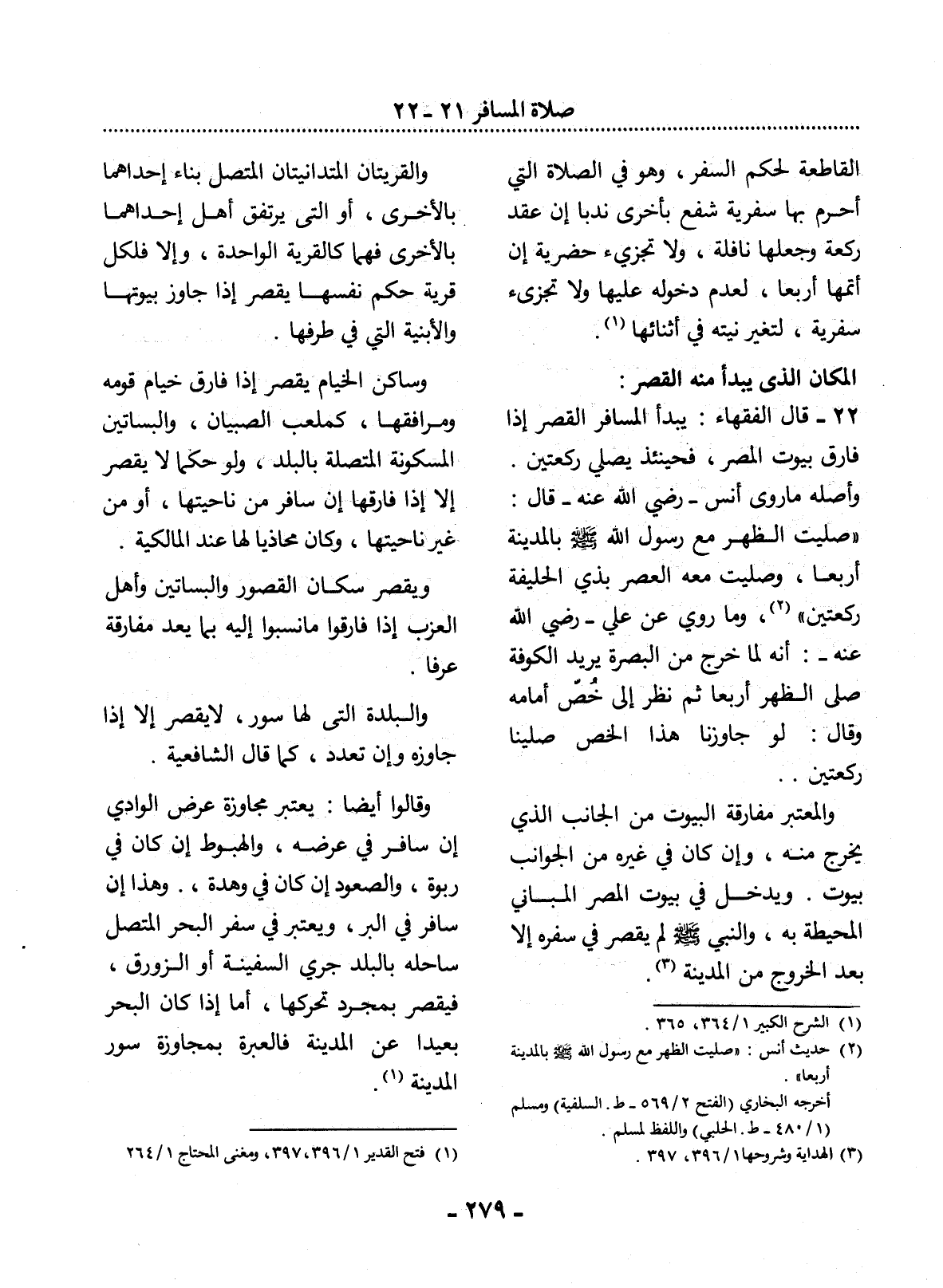 22 - قَال الْفُقَهَاءُ: يَبْدَأُ الْمُسَافِرُ الْقَصْرَ إِذَا فَارَقَ بُيُوتَ الْمِصْرِ، فَحِينَئِذٍ يُصَلِّي رَكْعَتَيْنِ. وَأَصْلُهُ مَا رَوَى أَنَسٌ - رَضِيَ اللَّهُ عَنْهُ - قَال: صَلَّيْتُ الظُّهْرَ مَعَ رَسُول اللَّهِ صَلَّى اللَّهُ عَلَيْهِ وَسَلَّمَ بِالْمَدِينَةِ أَرْبَعًا، وَصَلَّيْتُ مَعَهُ الْعَصْرَ بِذِي الْحُلَيْفَةِ رَكْعَتَيْنِ (2) ، وَمَا رُوِيَ عَنْ عَلِيٍّ - رَضِيَ اللَّهُ عَنْهُ -: أَنَّهُ لَمَّا خَرَجَ مِنَ الْبَصْرَةِ يُرِيدُ الْكُوفَةَ صَلَّى الظُّهْرَ أَرْبَعًا ثُمَّ نَظَرَ إِلَى خُصٍّ أَمَامَهُ وَقَال: لَوْ جَاوَزْنَا هَذَا الْخُصَّ صَلَّيْنَا رَكْعَتَيْنِ.