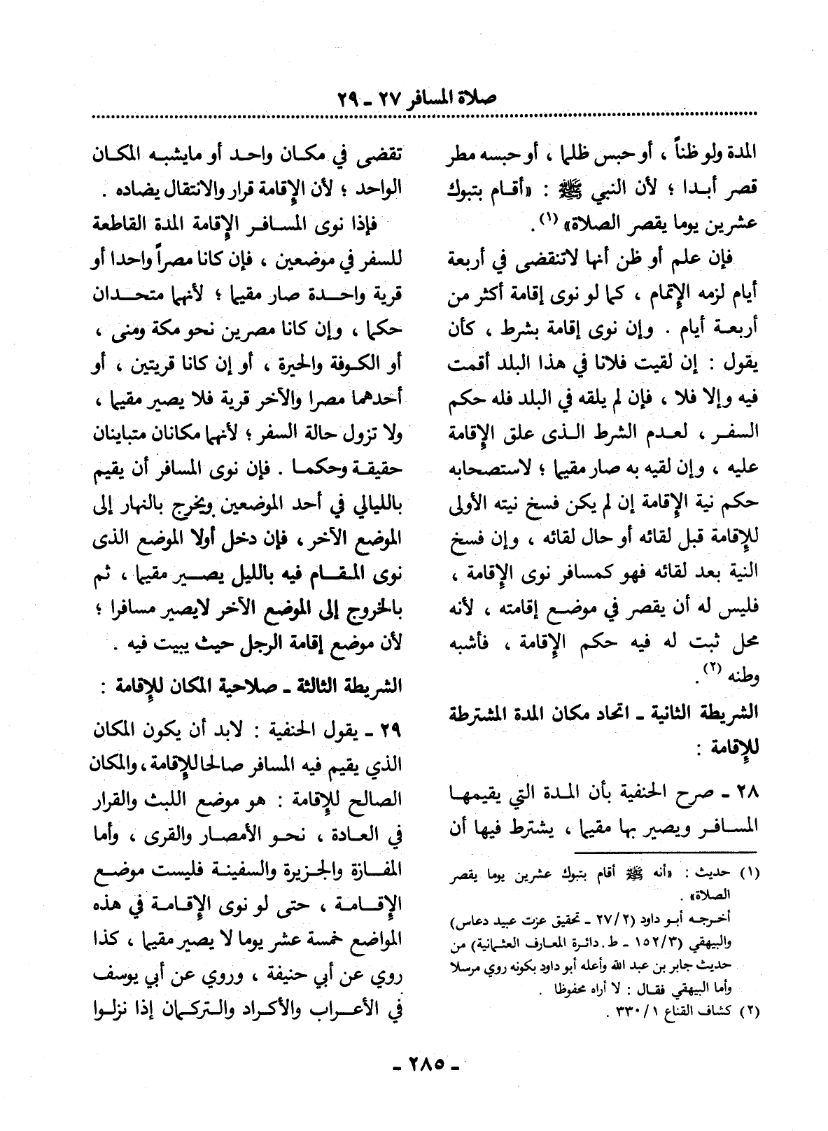 28 - صَرَّحَ الْحَنَفِيَّةُ بِأَنَّ الْمُدَّةَ الَّتِي يُقِيمُهَا الْمُسَافِرُ وَيَصِيرُ بِهَا مُقِيمًا، يُشْتَرَطُ فِيهَا أَنْ