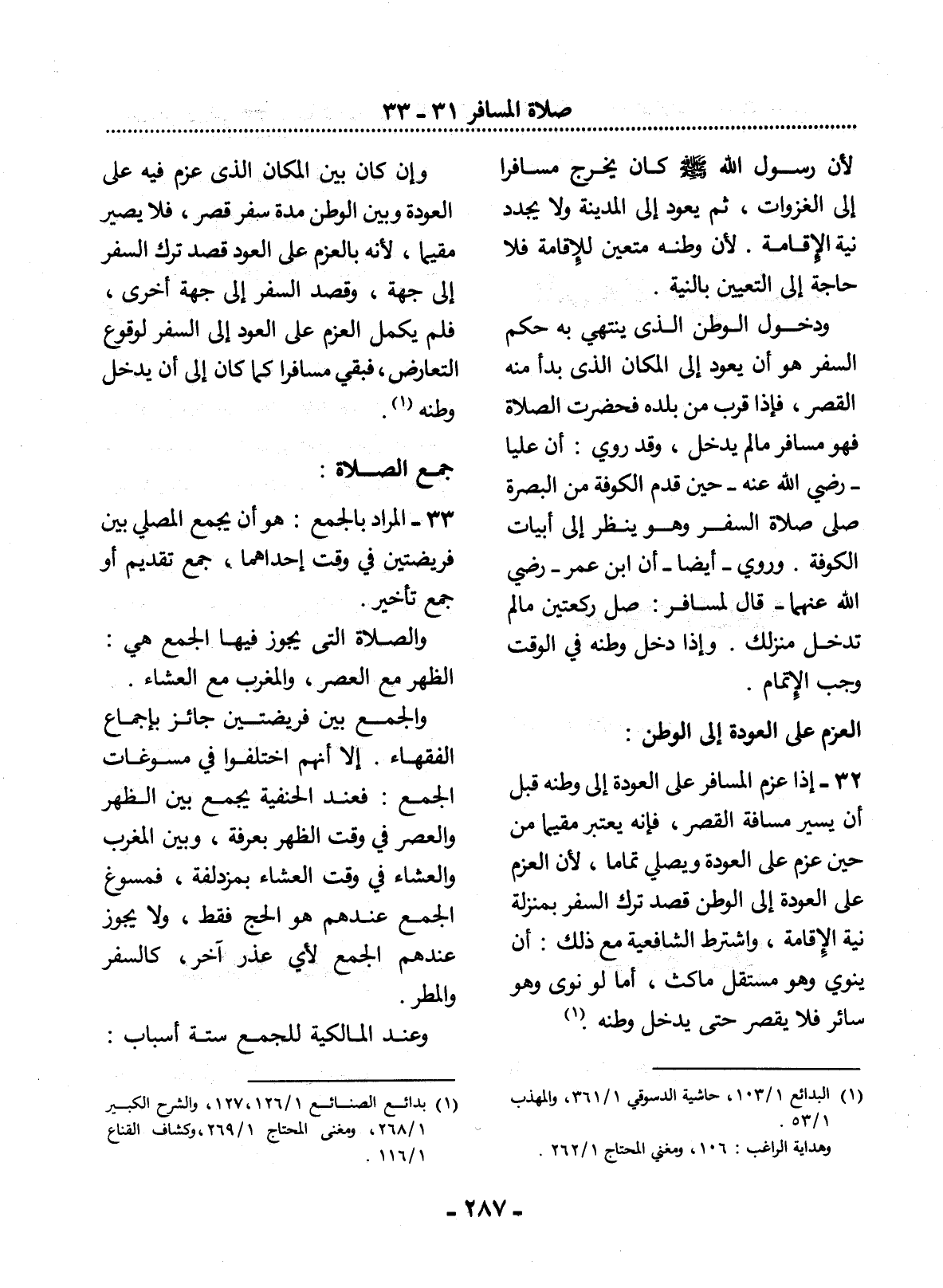 32 - إِذَا عَزَمَ الْمُسَافِرُ عَلَى الْعَوْدَةِ إِلَى وَطَنِهِ قَبْل أَنْ يَسِيرَ مَسَافَةَ الْقَصْرِ، فَإِنَّهُ يُعْتَبَرُ مُقِيمًا مِنْ حِينِ عَزَمَ عَلَى الْعَوْدَةِ وَيُصَلِّي تَمَامًا؛ لأَِنَّ الْعَزْمَ عَلَى الْعَوْدَةِ إِلَى الْوَطَنِ قَصْدُ تَرْكِ السَّفَرِ بِمَنْزِلَةِ نِيَّةِ الإِْقَامَةِ، وَاشْتَرَطَ الشَّافِعِيَّةُ مَعَ ذَلِكَ: أَنْ يَنْوِيَ وَهُوَ مُسْتَقِلٌّ مَاكِثٌ، أَمَّا لَوْ نَوَى وَهُوَ سَائِرٌ فَلاَ يَقْصُرُ حَتَّى يَدْخُل وَطَنَهُ (1) .