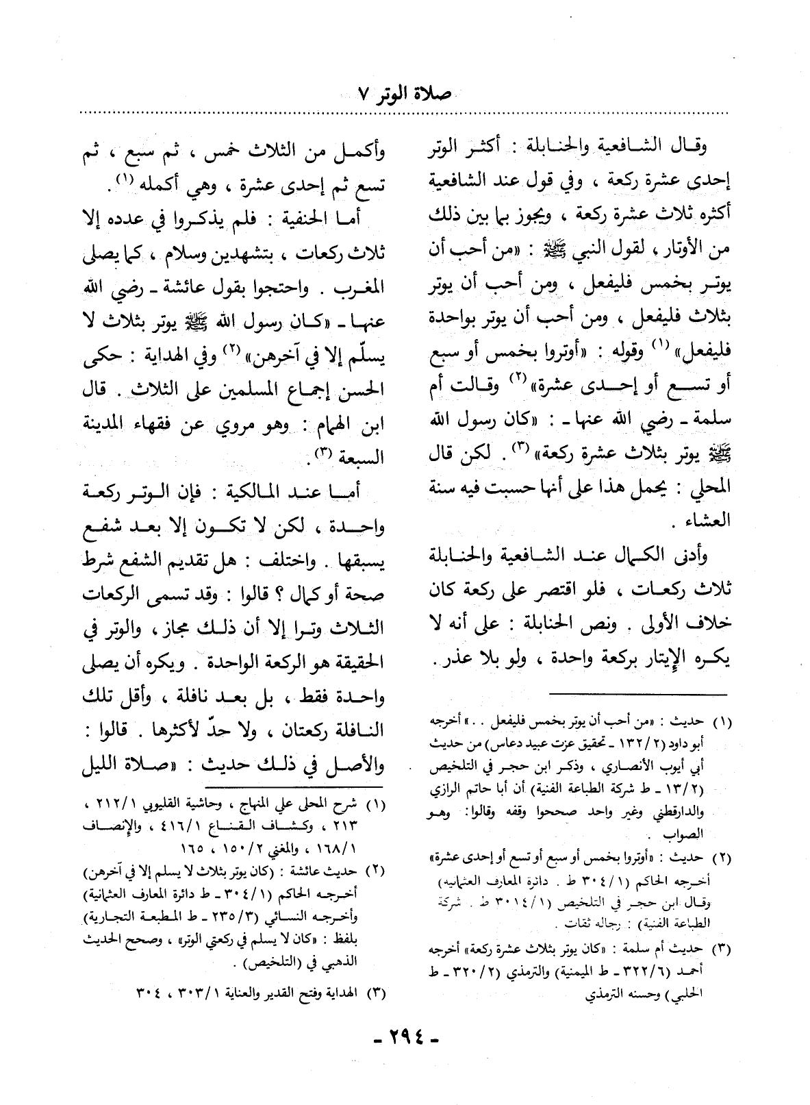 أَمَّا الْحَنَفِيَّةُ: فَلَمْ يَذْكُرُوا فِي عَدَدِهِ إِلاَّ ثَلاَثَ رَكَعَاتٍ، بِتَشَهُّدَيْنِ وَسَلاَمٍ، كَمَا يُصَلَّى الْمَغْرِبُ. وَاحْتَجُّوا بِقَوْل عَائِشَةَ - رَضِيَ اللَّهُ عَنْهَا - كَانَ رَسُول اللَّهِ صَلَّى اللَّهُ عَلَيْهِ وَسَلَّمَ يُوتِرُ بِثَلاَثٍ لاَ يُسَلِّمُ إِلاَّ فِي آخِرِهِنَّ (2) وَفِي الْهِدَايَةِ: حَكَى الْحَسَنُ إِجْمَاعَ الْمُسْلِمِينَ عَلَى الثَّلاَثِ. قَال ابْنُ الْهُمَامِ: وَهُوَ مَرْوِيٌّ عَنْ فُقَهَاءِ الْمَدِينَةِ السَّبْعَةِ (3) .