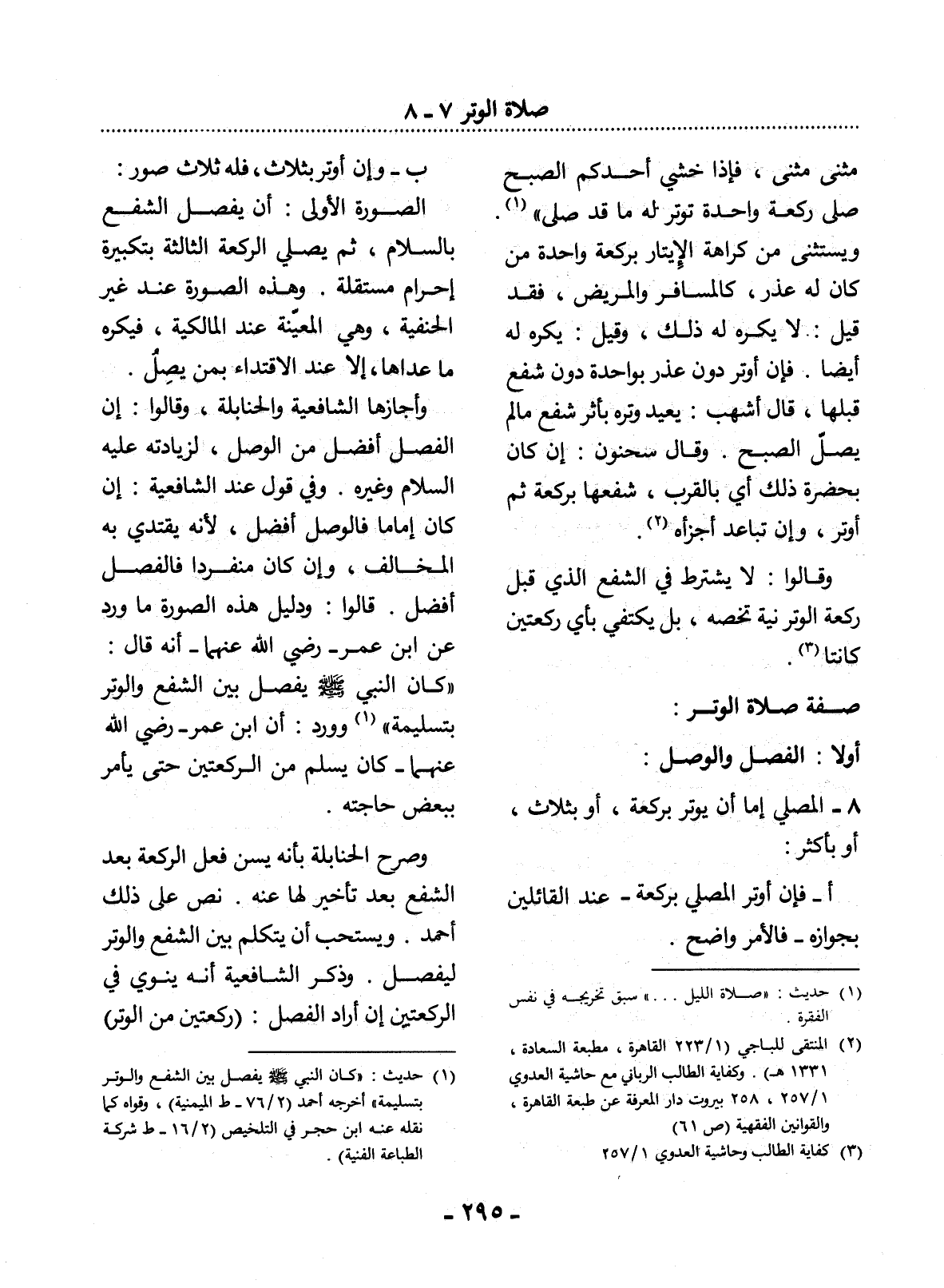 8 - الْمُصَلِّي إِمَّا أَنْ يُوتِرَ بِرَكْعَةٍ، أَوْ بِثَلاَثٍ، أَوْ بِأَكْثَرَ: