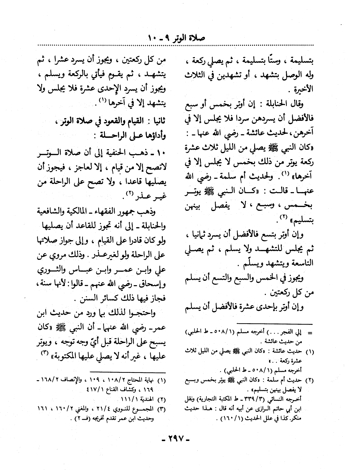 10 - ذَهَبَ الْحَنَفِيَّةُ إِلَى أَنَّ صَلاَةَ الْوِتْرِ لاَ تَصِحُّ إِلاَّ مِنْ قِيَامٍ، إِلاَّ لِعَاجِزٍ، فَيَجُوزُ أَنْ يُصَلِّيَهَا قَاعِدًا، وَلاَ تَصِحُّ عَلَى الرَّاحِلَةِ مِنْ غَيْرِ عُذْرٍ (2) .