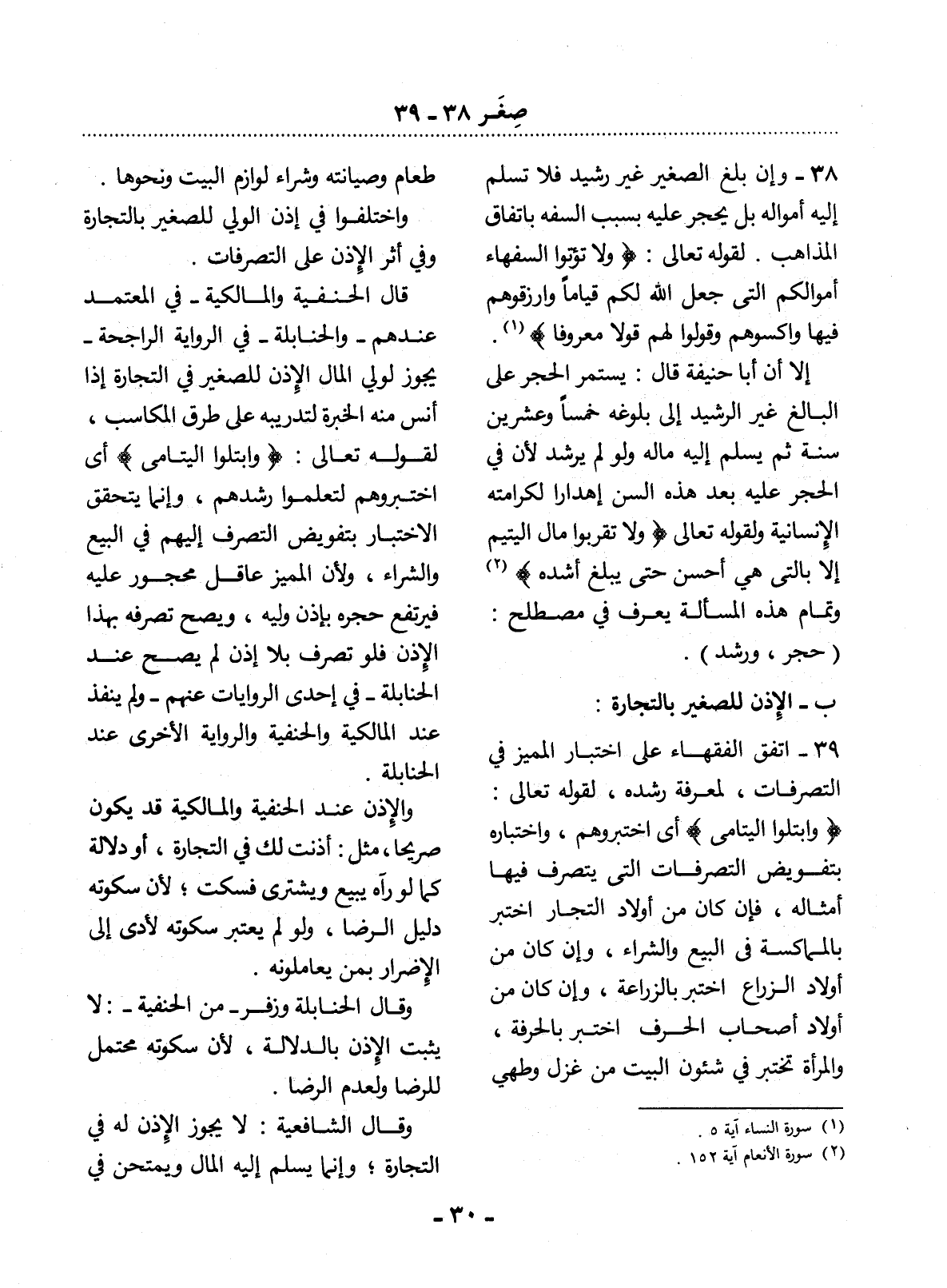 38 - وَإِنْ بَلَغَ الصَّغِيرُ غَيْرَ رَشِيدٍ فَلاَ تُسَلَّمُ إِلَيْهِ أَمْوَالُهُ بَل يُحْجَرُ عَلَيْهِ بِسَبَبِ السَّفَهِ بِاتِّفَاقِ الْمَذَاهِبِ؛ لِقَوْلِهِ تَعَالَى: {وَلاَ تُؤْتُوا السُّفَهَاءَ أَمْوَالَكُمُ الَّتِي جَعَل اللَّهُ لَكُمْ قِيَامًا وَارْزُقُوهُمْ فِيهَا وَاكْسُوهُمْ وَقُولُوا لَهُمْ قَوْلاً مَعْرُوفًا} (1) .