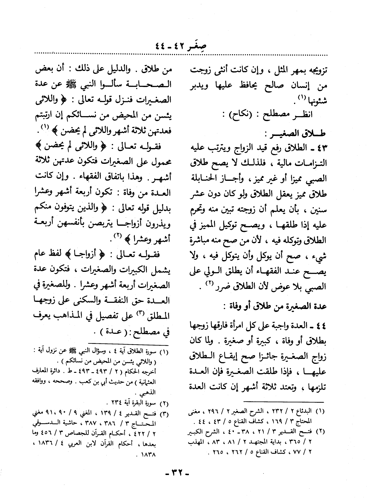 44 - الْعِدَّةُ وَاجِبَةٌ عَلَى كُل امْرَأَةٍ فَارَقَهَا زَوْجُهَا بِطَلاَقٍ أَوْ وَفَاةٍ، كَبِيرَةً أَوْ صَغِيرَةً، وَلَمَّا كَانَ زَوَاجُ الصَّغِيرَةِ جَائِزًا صَحَّ إِيقَاعُ الطَّلاَقِ عَلَيْهَا، فَإِذَا طَلُقَتِ الصَّغِيرَةُ فَإِنَّ الْعِدَّةَ تَلْزَمُهَا، وَتَعْتَدُّ ثَلاَثَةَ أَشْهُرٍ إِنْ كَانَتِ الْعِدَّةُ