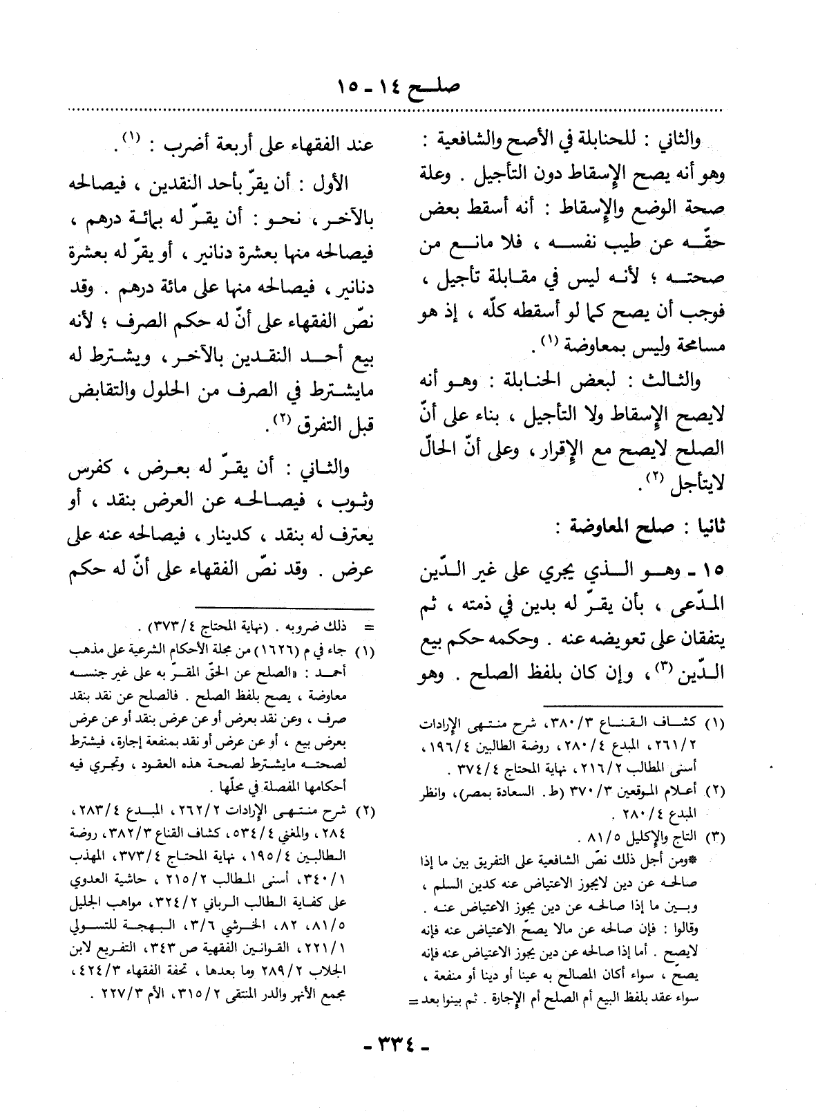 (1) جاء في م 1626 من مجلة الأحكام الشرعية على مذهب أحمد: " الصلح عن الحق المقر به على غير جنسه معاوضة، يصح بلفظ الصلح. فالصلح عن نقد بنقد صرف، وعن نقد بعرض أو عن عرض بنقد أو عن عرض بعرض بيع، أو عن عرض أو نقد بمنفعة إجارة، فيشترط لصحته ما يشترط لصحة هذه