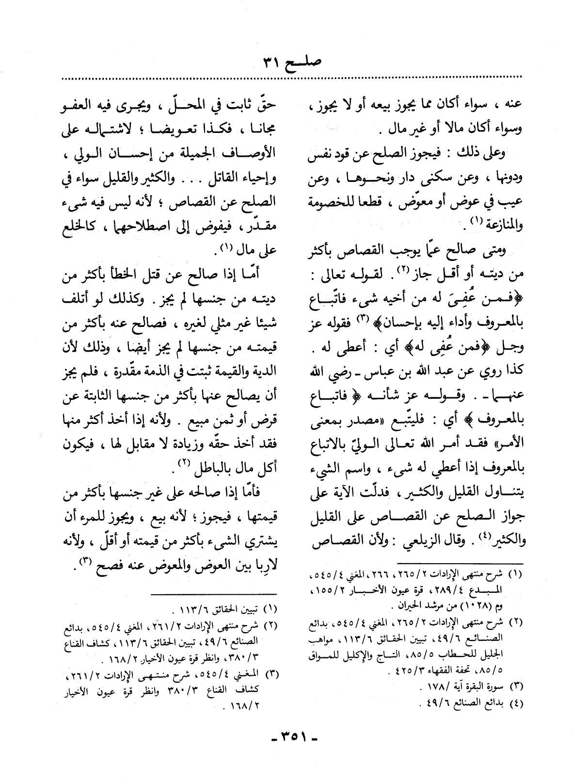 (2) شرح منتهى الإرادات 2 / 261، المغني 4 / 545، بدائع الصنائع 6 / 49، تبيين الحقائق 6 / 113، كشاف القناع 3 / 380، وانظر قرة عيون الأخيار 2 / 168.