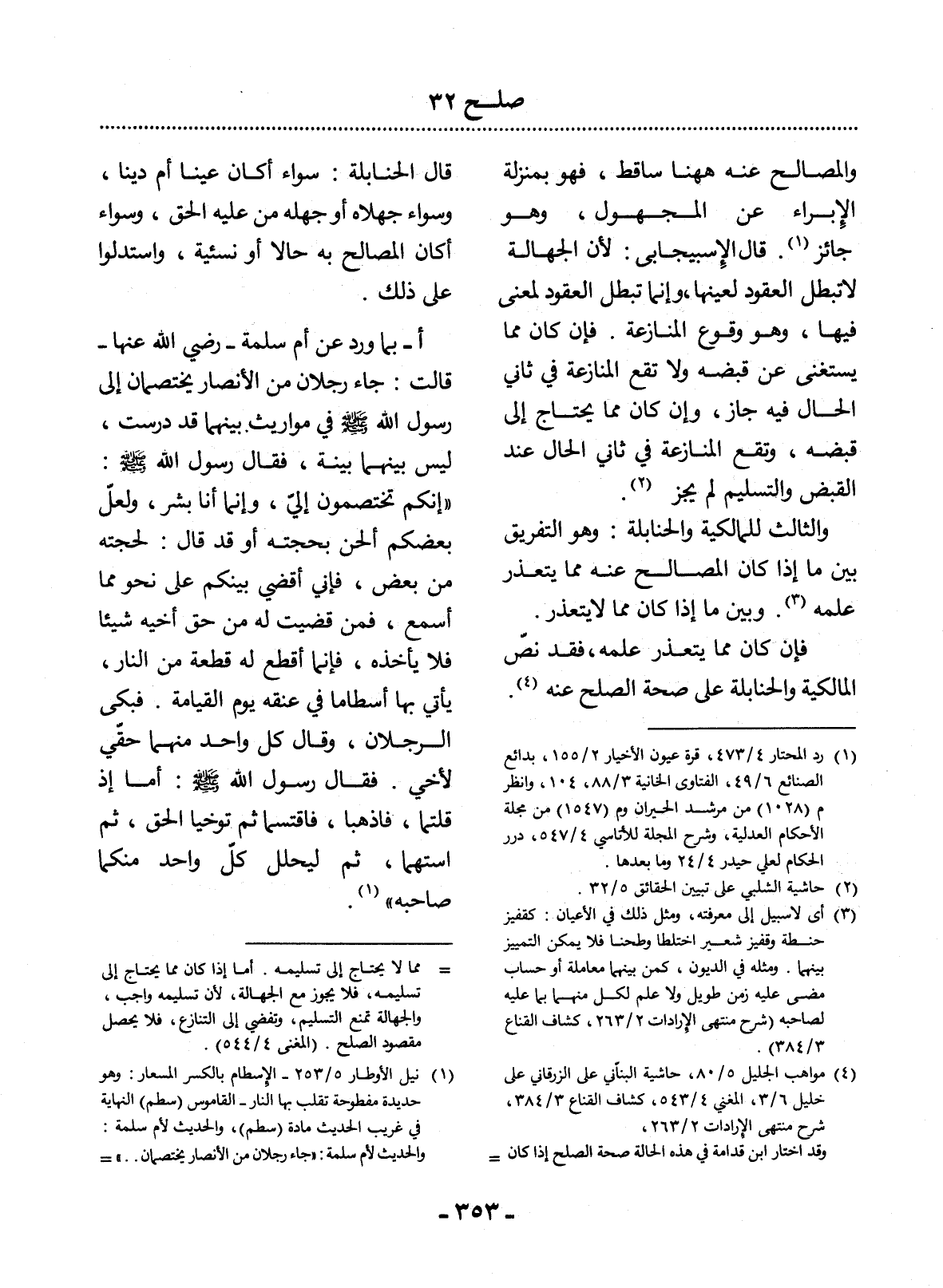 (4) مواهب الجليل 5 / 80، حاشية البناني على الزرقاني على خليل 6 / 3، المغني 4 / 543، كشاف القناع 3 / 384، شرح منتهى الإرادات 2 / 263، وقد اختار ابن قدامة في هذه الحالة صحة الصلح إذا كان مما لا يحتاج إلى تسليمه. أما إذا كان مما يحتاج إلى تسليمه، فلا يجوز مع الجهالة، لأن تسليمه واجب، والجهالة تمنع التسليم، وتفضي إلى التنازع، فلا يحصل مقصود الصلح. (المغني 4 / 544) .