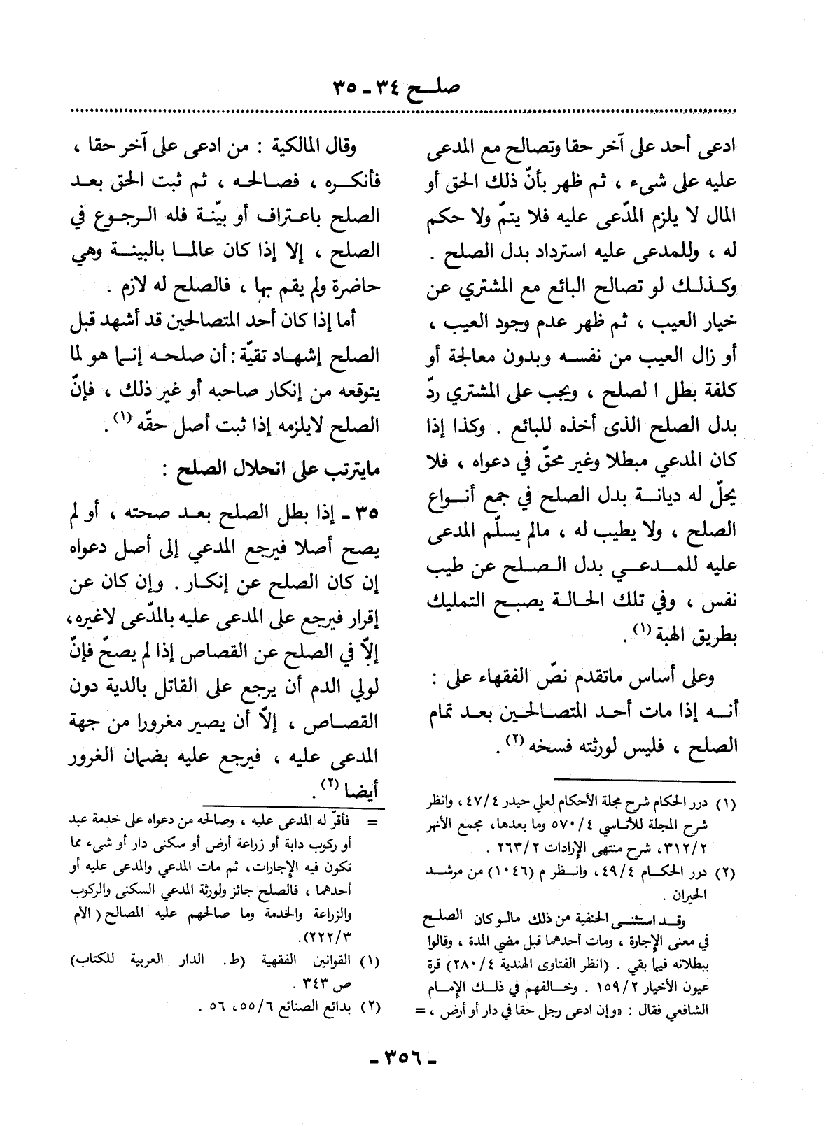 (2) درر الحكام 4 / 49، وانظر م (1046) من مرشد الحيران. وقد استثنى الحنفية من ذلك ما لو كان الصلح في معنى الإجارة، ومات أحدهما قبل مضي المدة، وقالوا ببطلانه فيما بقي. (انظر الفتاوى الهندية 4 / 280) قرة عيون الأخيار 2 / 159. وخالفهم في ذلك الإمام الشافعي فقال: " وإن ادعى رجل حقا في دار أو أرض، فأقر له المدعى عليه، وصالحه من دعواه على خدمة عبد أو ركوب دابة أو زراعة أرض أو سكنى دار أو شيء مما تكون فيه الإجارات، ثم مات المدعي والمدعى عليه أو أحدهما، فالصلح جائز ولورثة المد