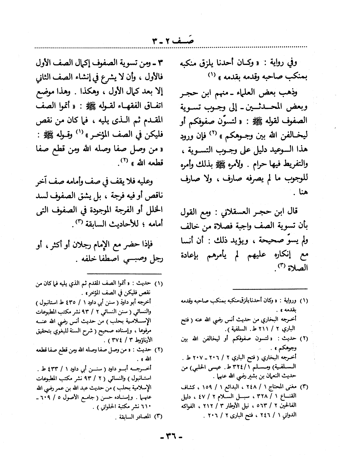 (2) حديث: " لتسون صفوفكم أو ليخالفن الله بين وجوهكم ". أخرجه البخاري (فتح الباري 2 / 206 - 207 ط. السلفية) ومسلم 1 / 324 ط. عيسي الحلبي) من حديث نعمان بن بشير رضي الله عنهما.