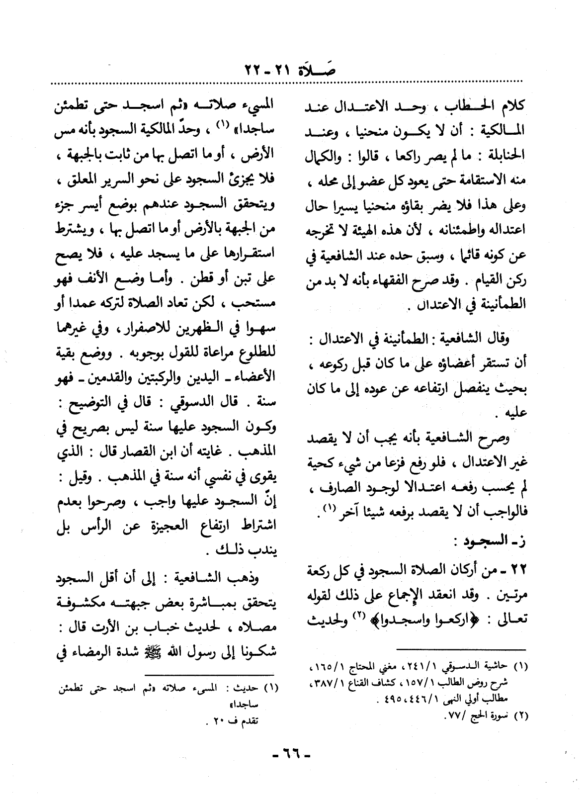 22 - مِنْ أَرْكَانِ الصَّلاَةِ السُّجُودُ فِي كُل رَكْعَةٍ مَرَّتَيْنِ. وَقَدِ انْعَقَدَ الإِْجْمَاعُ عَلَى ذَلِكَ لِقَوْلِهِ تَعَالَى: {ارْكَعُوا وَاسْجُدُوا (2) } وَلِحَدِيثِ