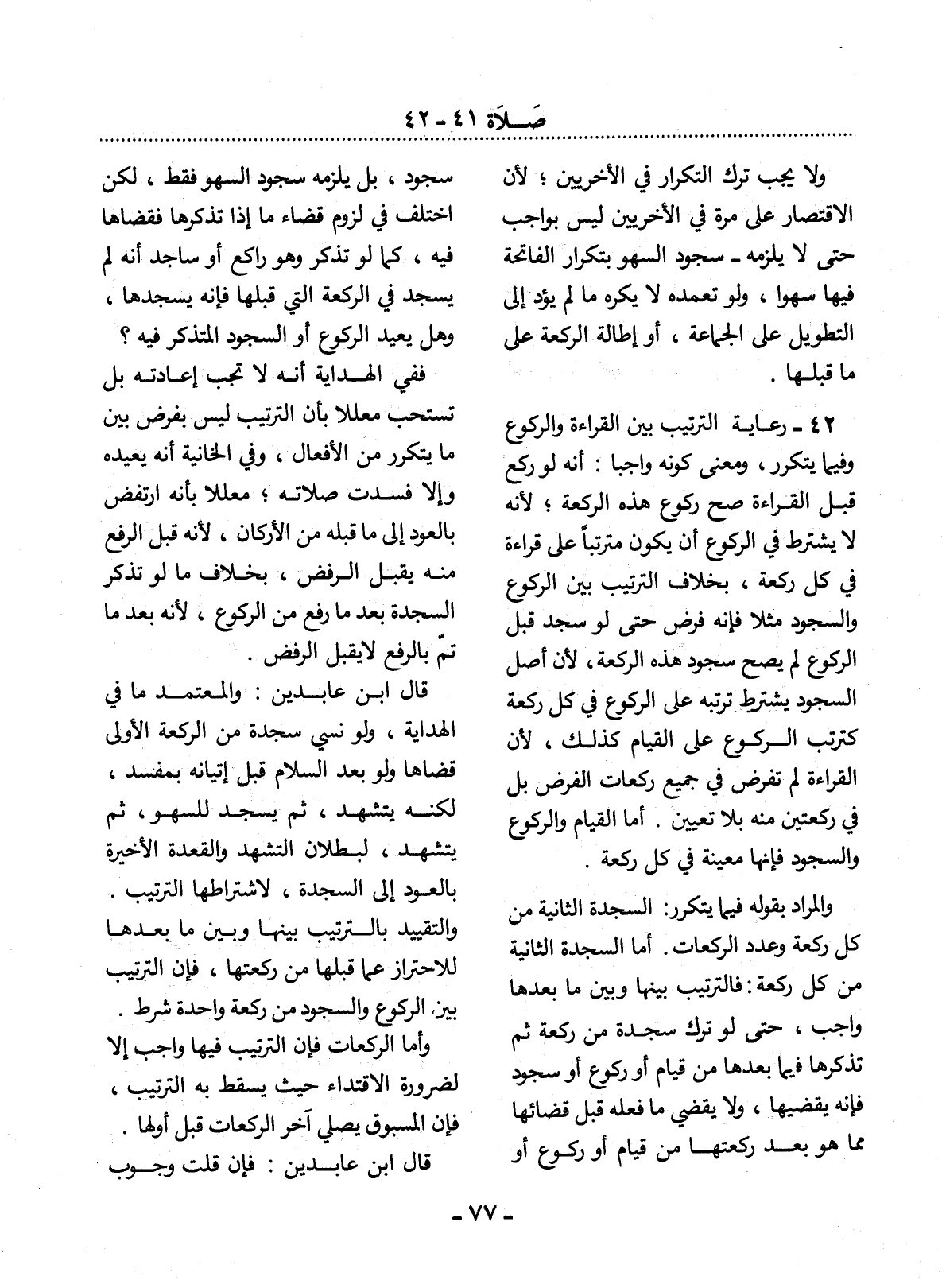 42 - رِعَايَةُ التَّرْتِيبِ بَيْنَ الْقِرَاءَةِ وَالرُّكُوعِ وَفِيمَا يَتَكَرَّرُ، وَمَعْنَى كَوْنِهِ وَاجِبًا: أَنَّهُ لَوْ رَكَعَ قَبْل الْقِرَاءَةِ صَحَّ رُكُوعُ هَذِهِ الرَّكْعَةِ؛ لأَِنَّهُ لاَ يُشْتَرَطُ فِي الرُّكُوعِ أَنْ يَكُونَ مُتَرَتِّبًا عَلَى قِرَاءَةٍ فِي كُل رَكْعَةٍ، بِخِلاَفِ التَّرْتِيبِ بَيْنَ الرُّكُوعِ وَالسُّجُودِ مَثَلاً فَإِنَّهُ فَرْضٌ حَتَّى لَوْ سَجَدَ قَبْل الرُّكُوعِ لَمْ يَصِحَّ سُجُودُ هَذِهِ الرَّكْعَةِ؛ لأَِنَّ أَصْل السُّجُودِ يُشْتَرَطُ تَرَتُّبُهُ عَلَى الرُّكُوعِ فِي كُل رَكْعَةٍ كَتَرَتُّبِ الرُّكُوعِ عَلَى الْقِيَامِ كَذَلِكَ؛ لأَِنَّ الْقِرَاءَةَ لَمْ تُفْرَضْ فِي جَمِيعِ رَكَعَاتِ الْفَرْضِ بَل فِي رَكْعَتَيْنِ مِنْهُ بِلاَ تَعْيِينٍ. أَمَّا الْقِيَامُ وَالرُّكُوعُ وَالسُّجُودُ فَإِنَّهَا مُعَيَّنَةٌ فِي كُل رَكْعَةٍ.