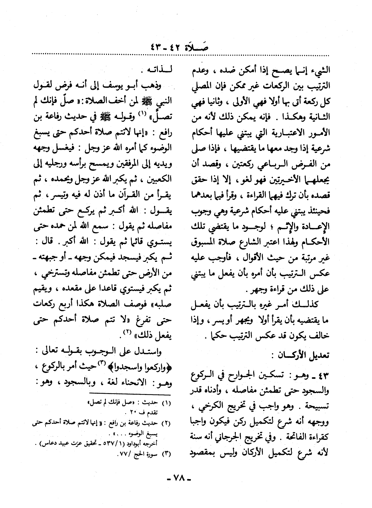 43 - وَهُوَ: تَسْكِينُ الْجَوَارِحِ فِي الرُّكُوعِ وَالسُّجُودِ حَتَّى تَطْمَئِنَّ مَفَاصِلُهُ، وَأَدْنَاهُ قَدْرُ تَسْبِيحَةٍ، وَهُوَ وَاجِبٌ فِي تَخْرِيجِ الْكَرْخِيِّ، وَوَجْهُهُ أَنَّهُ شُرِعَ لِتَكْمِيل رُكْنٍ فَيَكُونُ وَاجِبًا كَقِرَاءَةِ الْفَاتِحَةِ. وَفِي تَخْرِيجِ الْجُرْجَانِيِّ أَنَّهُ سُنَّةٌ لأَِنَّهُ شُرِعَ لِتَكْمِيل الأَْرْكَانِ وَلَيْسَ بِمَقْصُودٍ