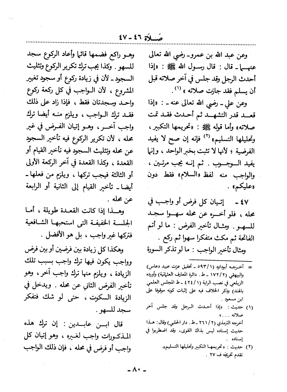 47 - إِتْيَانُ كُل فَرْضٍ أَوْ وَاجِبٍ فِي مَحَلِّهِ، فَلَوْ أَخَّرَهُ عَنْ مَحَلِّهِ سَهْوًا سَجَدَ لِلسَّهْوِ. وَمِثَال تَأْخِيرِ الْفَرْضِ: مَا لَوْ أَتَمَّ الْفَاتِحَةَ ثُمَّ مَكَثَ مُتَفَكِّرًا سَهْوًا ثُمَّ رَكَعَ.
