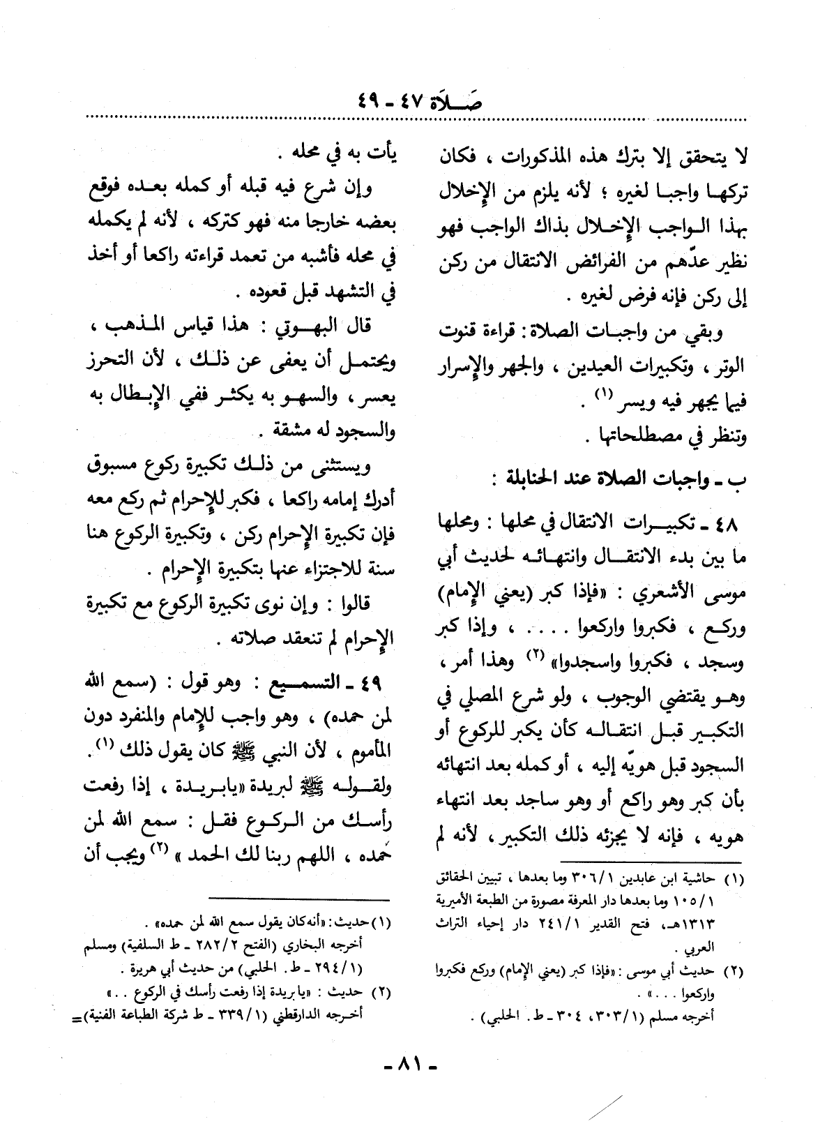 49 - التَّسْمِيعُ: وَهُوَ قَوْل: (سَمِعَ اللَّهُ لِمَنْ حَمِدَهُ) ، وَهُوَ وَاجِبٌ لِلإِْمَامِ وَالْمُنْفَرِدِ دُونَ الْمَأْمُومِ؛ لأَِنَّ النَّبِيَّ صَلَّى اللَّهُ عَلَيْهِ وَسَلَّمَ كَانَ يَقُول ذَلِكَ (1) . {