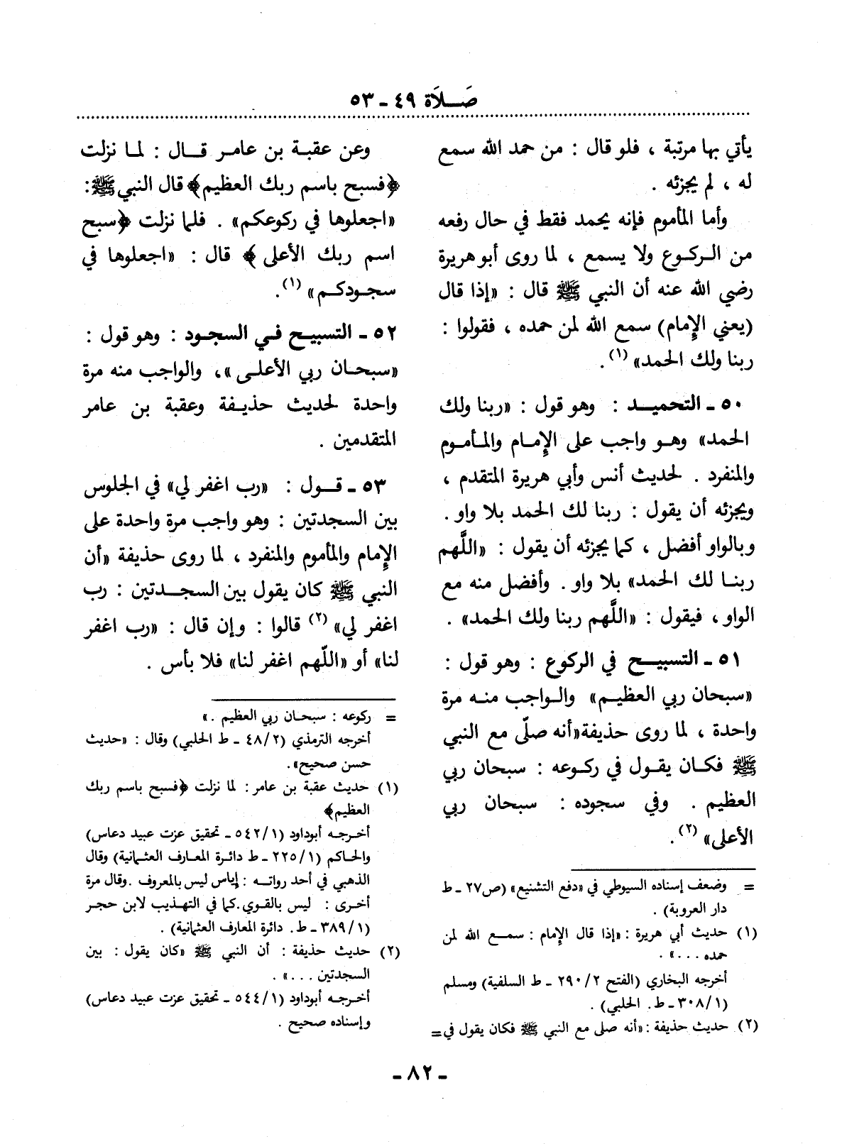 51 - التَّسْبِيحُ فِي الرُّكُوعِ: وَهُوَ قَوْل: " سُبْحَانَ رَبِّي الْعَظِيمِ " وَالْوَاجِبُ مِنْهُ مَرَّةٌ وَاحِدَةٌ، لِمَا رَوَى حُذَيْفَةُ أَنَّهُ صَلَّى مَعَ النَّبِيِّ صَلَّى اللَّهُ عَلَيْهِ وَسَلَّمَ فَكَانَ يَقُول فِي رُكُوعِهِ: سُبْحَانَ رَبِّي الْعَظِيمِ. وَفِي سُجُودِهِ: سُبْحَانَ رَبِّي الأَْعْلَى (2) .