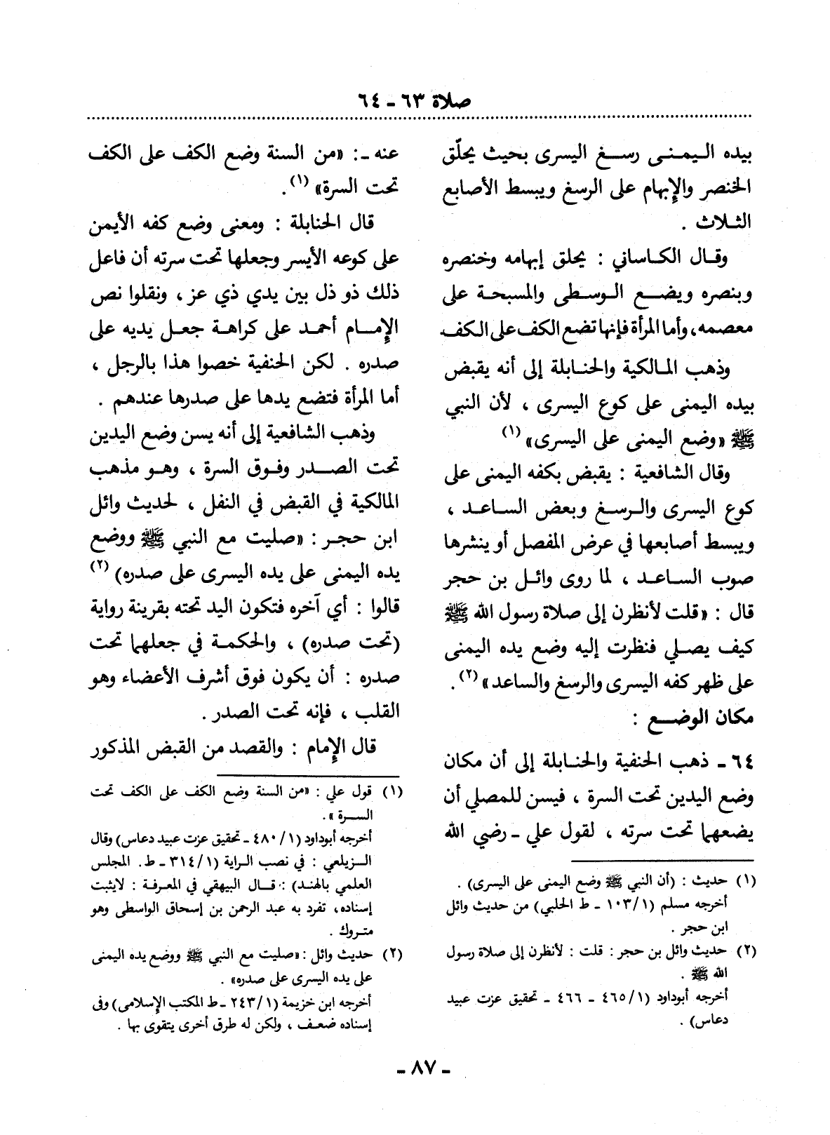 64 - ذَهَبَ الْحَنَفِيَّةُ وَالْحَنَابِلَةُ إِلَى أَنَّ مَكَانَ وَضْعِ الْيَدَيْنِ تَحْتَ السُّرَّةِ، فَيُسَنُّ لِلْمُصَلِّي أَنْ يَضَعَهُمَا تَحْتَ سُرَّتِهِ، لِقَوْل عَلِيٍّ - رَضِيَ اللَّهُ عَنْهُ