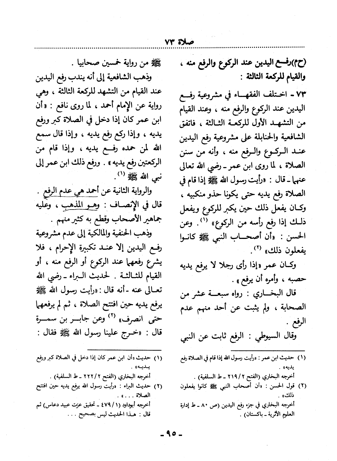 73 - اخْتَلَفَ الْفُقَهَاءُ فِي مَشْرُوعِيَّةِ رَفْعِ الْيَدَيْنِ عِنْدَ الرُّكُوعِ وَالرَّفْعِ مِنْهُ، وَعِنْدَ الْقِيَامِ مِنَ التَّشَهُّدِ الأَْوَّل لِلرَّكْعَةِ الثَّالِثَةِ، فَاتَّفَقَ الشَّافِعِيَّةُ وَالْحَنَابِلَةُ عَلَى مَشْرُوعِيَّةِ رَفْعِ الْيَدَيْنِ عِنْدَ الرُّكُوعِ وَالرَّفْعِ مِنْهُ، وَأَنَّهُ مِنْ سُنَنِ الصَّلاَةِ؛ لِمَا رَوَى ابْنُ عُمَرَ - رَضِيَ اللَّهُ تَعَالَى عَنْهُمَا - قَال: رَأَيْتُ رَسُول اللَّهِ صَلَّى اللَّهُ عَلَيْهِ وَسَلَّمَ إِذَا قَامَ فِي الصَّلاَةِ رَفَعَ يَدَيْهِ حَتَّى يَكُونَا حَذْوَ مَنْكِبَيْهِ، وَكَانَ يَفْعَل ذَلِكَ حِينَ يُكَبِّرُ لِلرُّكُوعِ وَيَفْعَل ذَلِكَ إِذَا رَفَعَ رَأْسَهُ مِنَ الرُّكُوعِ (1) . وَعَنِ الْحَسَنِ: " أَنَّ أَصْحَابَ النَّبِيِّ صَلَّى اللَّهُ عَلَيْهِ وَسَلَّمَ كَانُوا يَفْعَلُونَ ذَلِكَ (2) ".