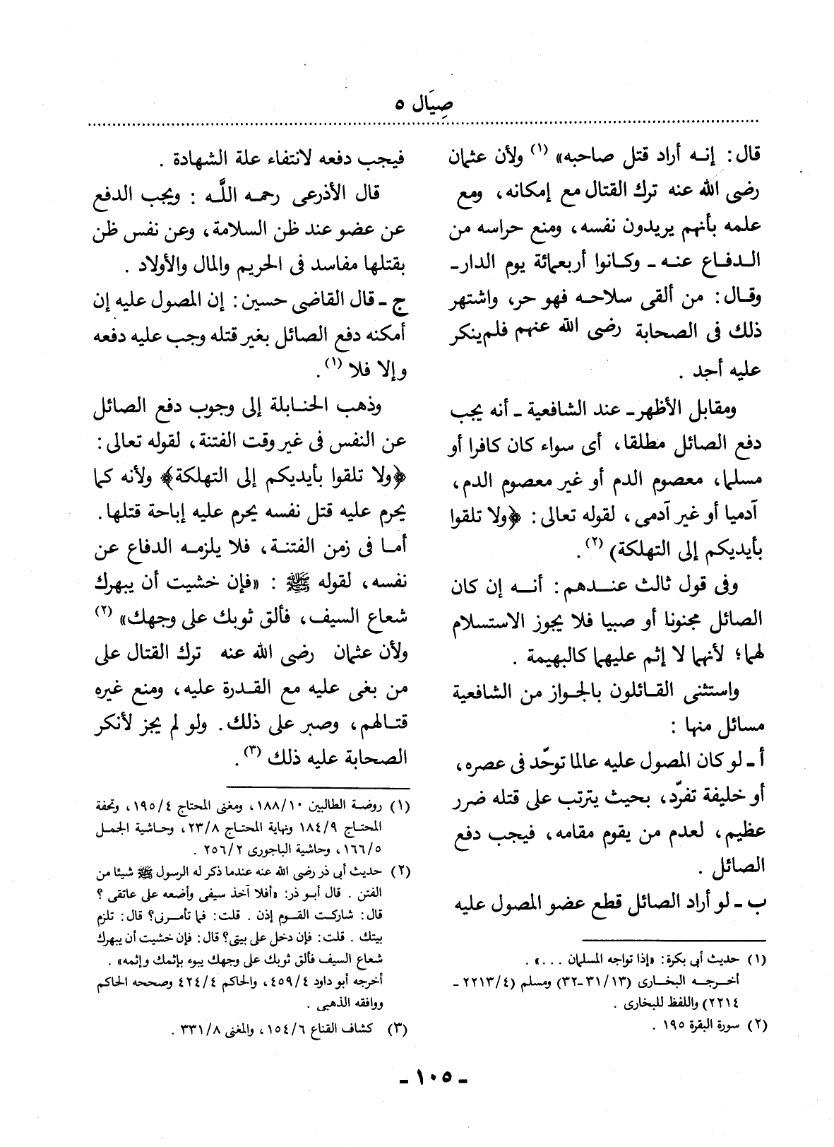 وَذَهَبَ الْحَنَابِلَةُ إِلَى وُجُوبِ دَفْعِ الصَّائِل عَنِ النَّفْسِ فِي غَيْرِ وَقْتِ الْفِتْنَةِ، لِقَوْلِهِ تَعَالَى: {وَلاَ تُلْقُوا بِأَيْدِيكُمْ إِلَى التَّهْلُكَةِ} وَلأَِنَّهُ كَمَا يَحْرُمُ عَلَيْهِ قَتْل نَفْسِهِ يَحْرُمُ عَلَيْهِ إِبَاحَةُ قَتْلِهَا.