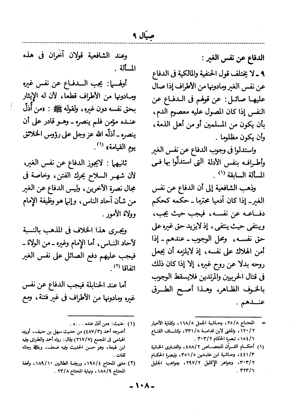ثَانِيهِمَا: لاَ يَجُوزُ الدِّفَاعُ عَنْ نَفْسِ الْغَيْرِ، لأَِنَّ شَهْرَ السِّلاَحِ يُحَرِّكُ الْفِتَنَ، وَخَاصَّةً فِي مَجَال نُصْرَةِ الآْخَرِينَ، وَلَيْسَ الدِّفَاعُ عَنِ الْغَيْرِ مِنْ شَأْنِ آحَادِ النَّاسِ، وَإِنَّمَا هُوَ وَظِيفَةُ الإِْمَامِ وَوُلاَةِ الأُْمُورِ.
