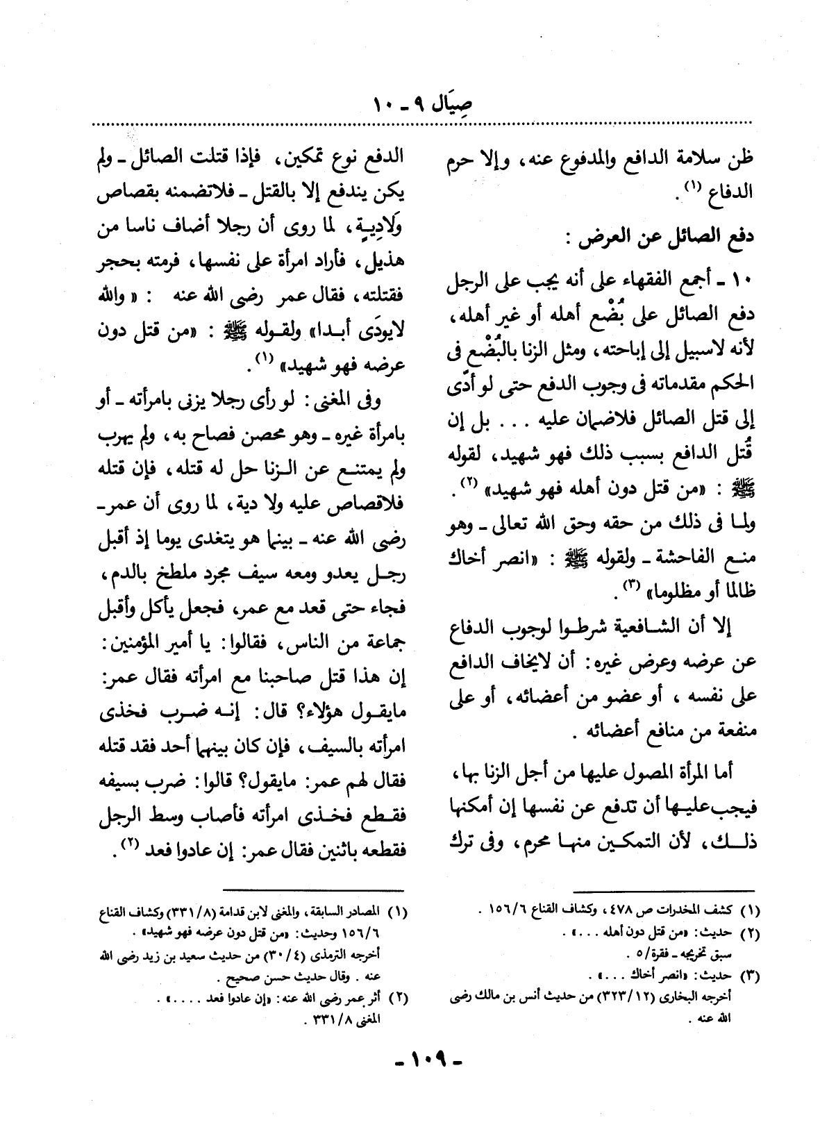 (1) المصادر السابقة، والمغني لابن قدامة (8 / 331) وكشاف القناع 6 / 156، وحديث: " من قتل دون عرضه فهو شهيد ". أخرجه الترمذي (4 / 30) من حديث سعيد بن زيد رضي الله عنه، وقال حديث حسن صحيح.