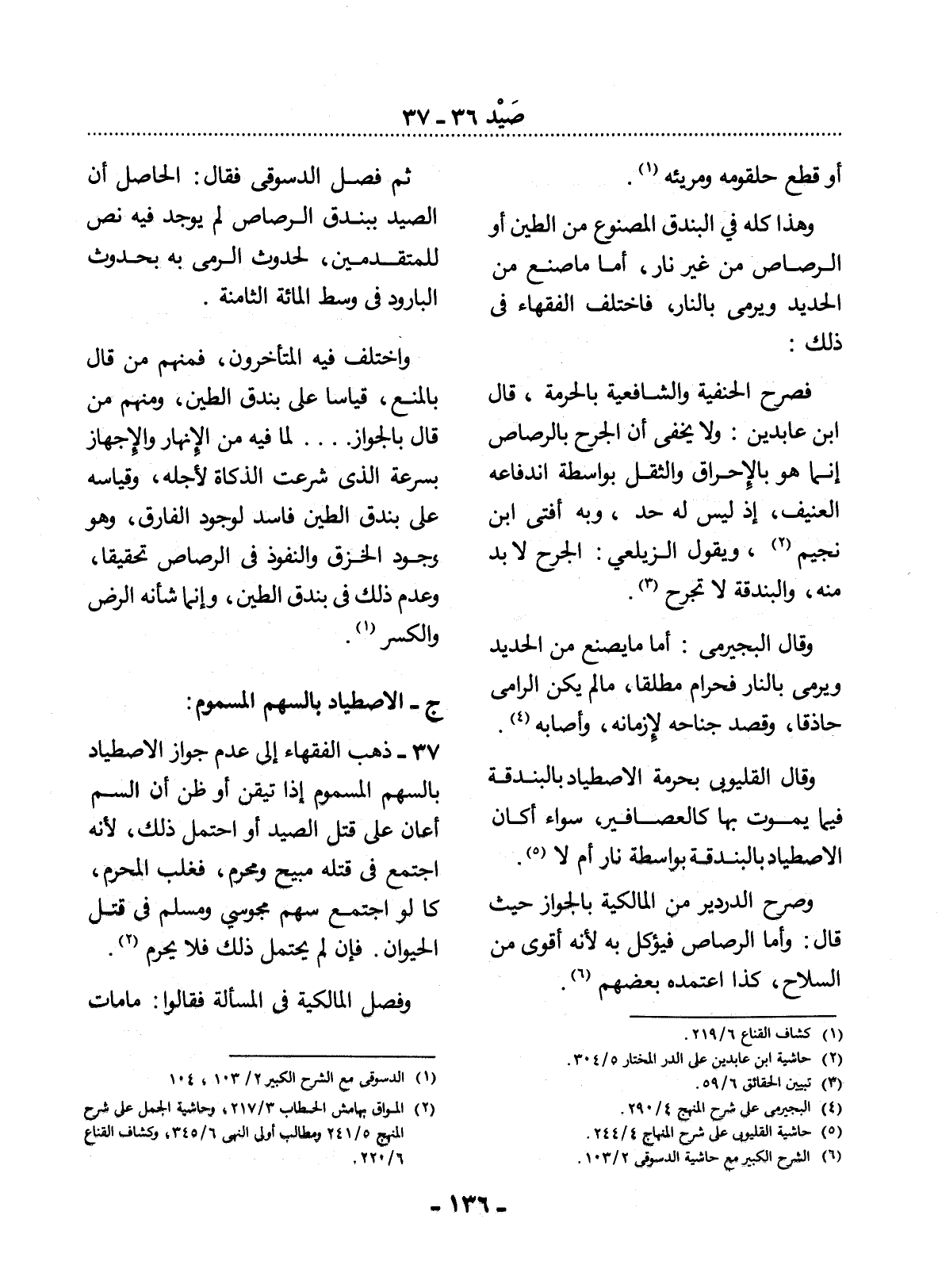 ثُمَّ فَصَّل الدُّسُوقِيُّ فَقَال: الْحَاصِل أَنَّ الصَّيْدَ بِبُنْدُقِ الرَّصَاصِ لَمْ يُوجَدْ فِيهِ نَصٌّ لِلْمُتَقَدِّمِينَ، لِحُدُوثِ الرَّمْيِ بِهِ بِحُدُوثِ الْبَارُودِ فِي وَسَطِ الْمِائَةِ الثَّامِنَةِ.