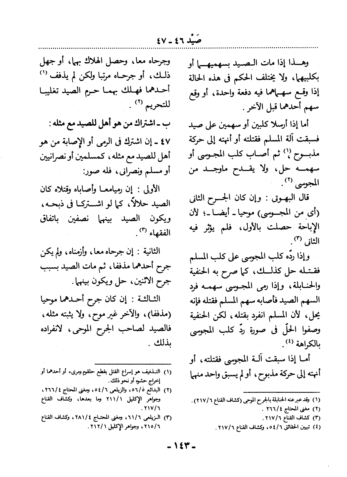 47 - إِنِ اشْتَرَكَ فِي الرَّمْيِ أَوِ الإِْصَابَةِ مَنْ هُوَ أَهْلٌ لِلصَّيْدِ مَعَ مِثْلِهِ، كَمُسْلِمَيْنِ أَوْ نَصْرَانِيَّيْنِ أَوْ مُسْلِمٍ وَنَصْرَانِيٍّ، فَلَهُ صُوَرٌ: