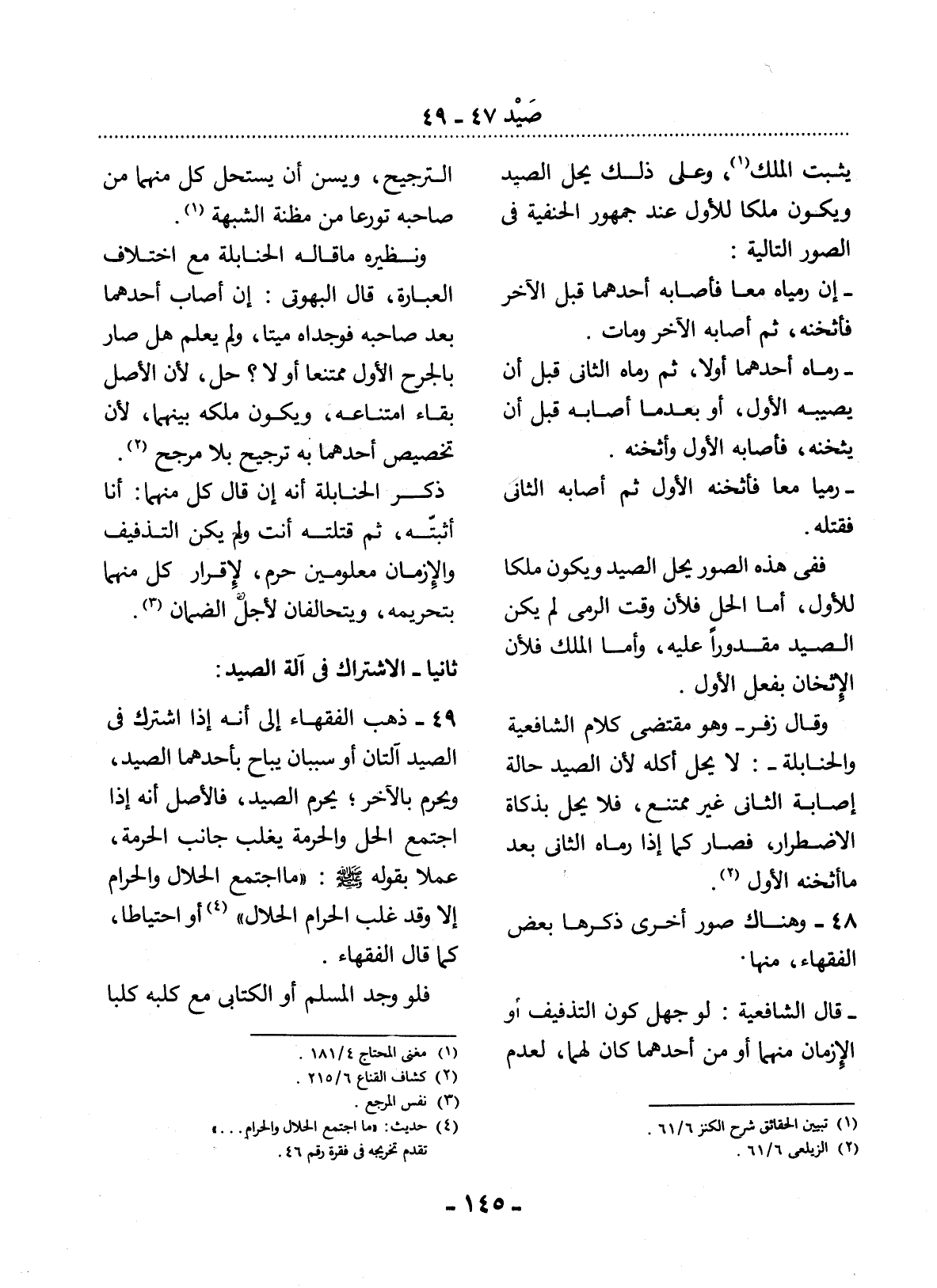 49 - ذَهَبَ الْفُقَهَاءُ إِلَى أَنَّهُ إِذَا اشْتَرَكَ فِي الصَّيْدِ آلَتَانِ أَوْ سَبَبَانِ يُبَاحُ بِأَحَدِهِمَا الصَّيْدُ، وَيَحْرُمُ بِالآْخَرِ - يَحْرُمُ الصَّيْدُ، فَالأَْصْل أَنَّهُ إِذَا اجْتَمَعَ الْحِل وَالْحُرْمَةُ يُغَلَّبُ جَانِبُ الْحُرْمَةِ، عَمَلاً بِقَوْلِهِ: مَا اجْتَمَعَ الْحَلاَل وَالْحَرَامُ إِلاَّ وَقَدْ غَلَبَ الْحَرَامُ الْحَلاَل (4) أَوِ احْتِيَاطًا، كَمَا قَال الْفُقَهَاءُ.