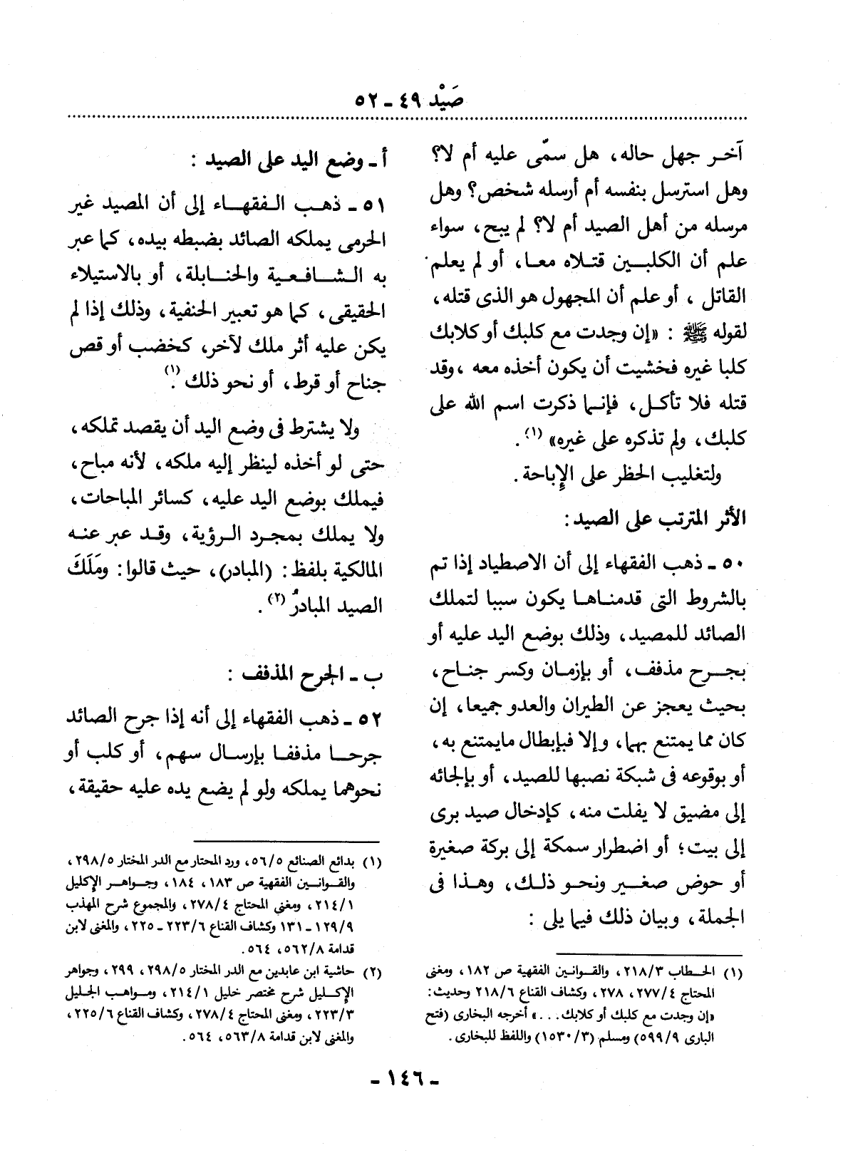 (1) الحطاب 3 / 218، والقوانين الفقهية ص 182، ومغني المحتاج 4 / 277، 278، وكشاف القناع 6 / 218، وحديث: " إن وجدت مع كلبك أو كلابك. . . ". أخرجه البخاري (فتح الباري 9 / 599) ، ومسلم (3 / 1530) واللفظ للبخاري.