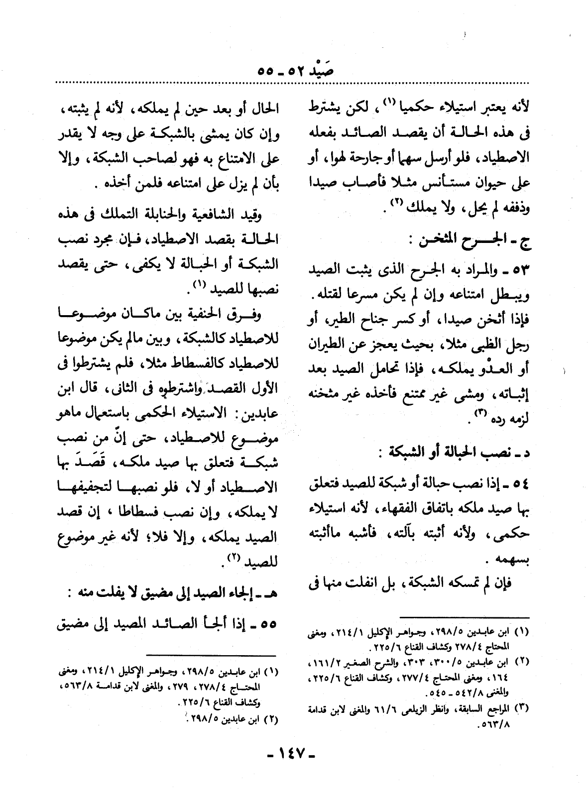 54 - إِذَا نَصَبَ حِبَالَةً أَوْ شَبَكَةً لِلصَّيْدِ فَتَعَلَّقَ بِهَا صَيْدٌ مَلَكَهُ بِاتِّفَاقِ الْفُقَهَاءِ، لأَِنَّهُ اسْتِيلاَءٌ حُكْمِيٌّ، وَلأَِنَّهُ أَثْبَتَهُ بِآلَتِهِ، فَأَشْبَهَ مَا أَثْبَتَهُ بِسَهْمِهِ.