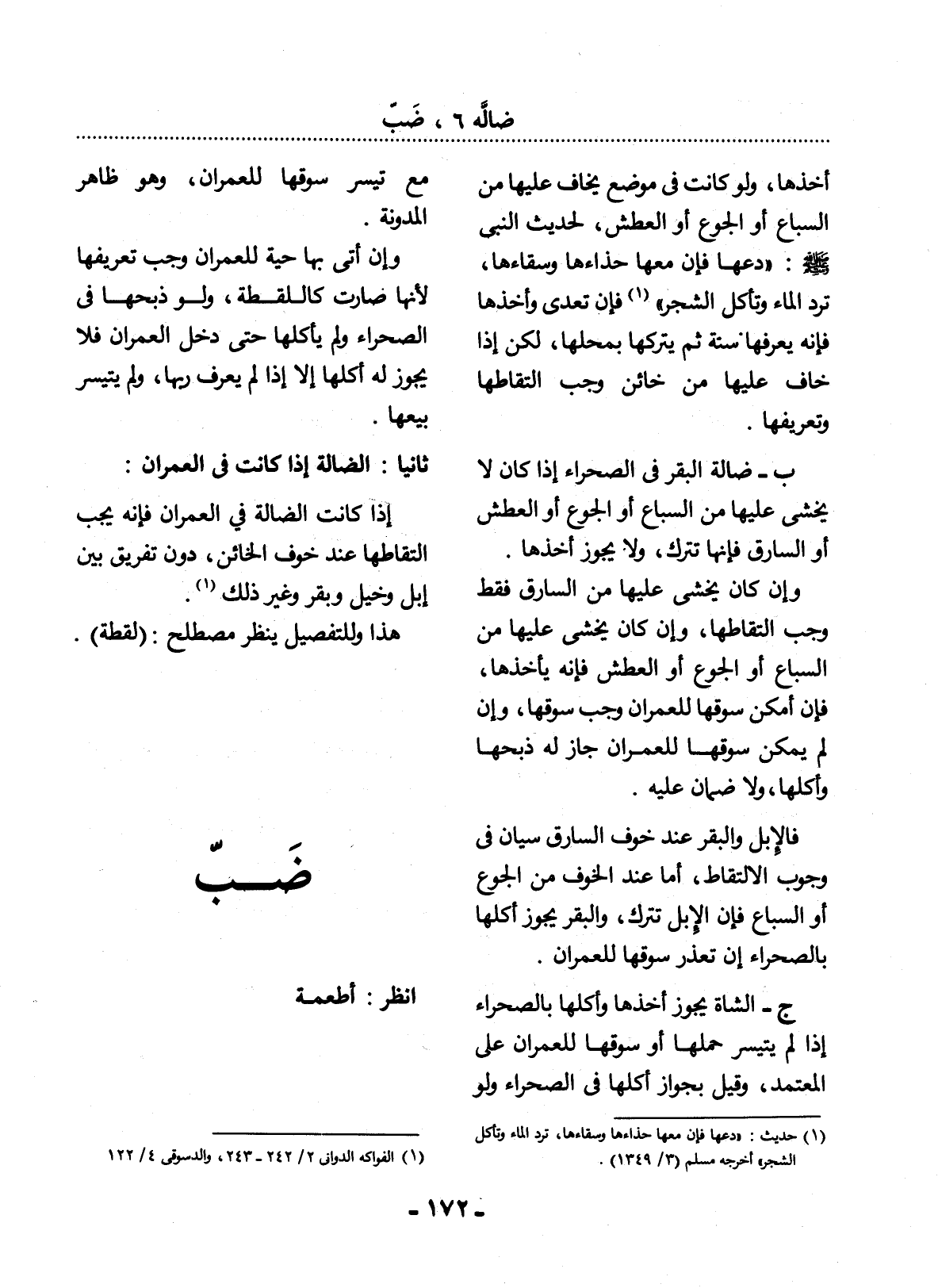 إِذَا كَانَتِ الضَّالَّةُ فِي الْعُمْرَانِ فَإِنَّهُ يَجِبُ الْتِقَاطُهَا عِنْدَ خَوْفِ الْخَائِنِ، دُونَ تَفْرِيقٍ بَيْنَ إِبِلٍ وَخَيْلٍ وَبَقَرٍ وَغَيْرِ ذَلِكَ (1) .