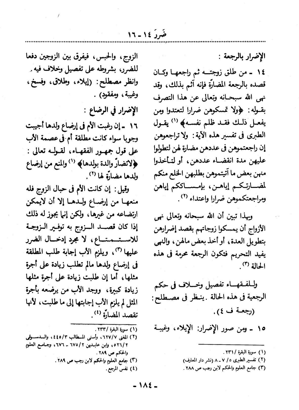 14 - مَنْ طَلَّقَ زَوْجَتَهُ ثُمَّ رَاجَعَهَا وَكَانَ قَصْدُهُ بِالرَّجْعَةِ الْمُضَارَّةَ فَإِنَّهُ آثِمٌ بِذَلِكَ، وَقَدْ نَهَى اللَّهُ سُبْحَانَهُ وَتَعَالَى عَنْ هَذَا التَّصَرُّفِ بِقَوْلِهِ: {وَلاَ تُمْسِكُوهُنَّ ضِرَارًا لِتَعْتَدُوا وَمَنْ يَفْعَل ذَلِكَ فَقَدْ ظَلَمَ نَفْسَهُ} (1) يَقُول الطَّبَرِيُّ فِي تَفْسِيرِ هَذِهِ الآْيَةِ: وَلاَ تُرَاجِعُوهُنَّ إِنْ رَاجَعْتُمُوهُنَّ فِي عِدَدِهِنَّ مُضَارَّةً لَهُنَّ لِتُطَوِّلُوا عَلَيْهِنَّ مُدَّةَ انْقِضَاءِ عِدَدِهِنَّ، أَوْ لِتَأْخُذُوا مِنْهُنَّ بَعْضَ مَا آتَيْتُمُوهُنَّ بِطَلَبِهِنَّ الْخُلْعَ مِنْكُمْ لِمُضَارَّتِكُمْ إِيَّاهُنَّ، بِإِمْسَاكِكُمْ إِيَّاهُنَّ وَمُرَاجَعَتِكُمُوهُنَّ ضِرَارًا وَاعْتِدَاءً (2) .
