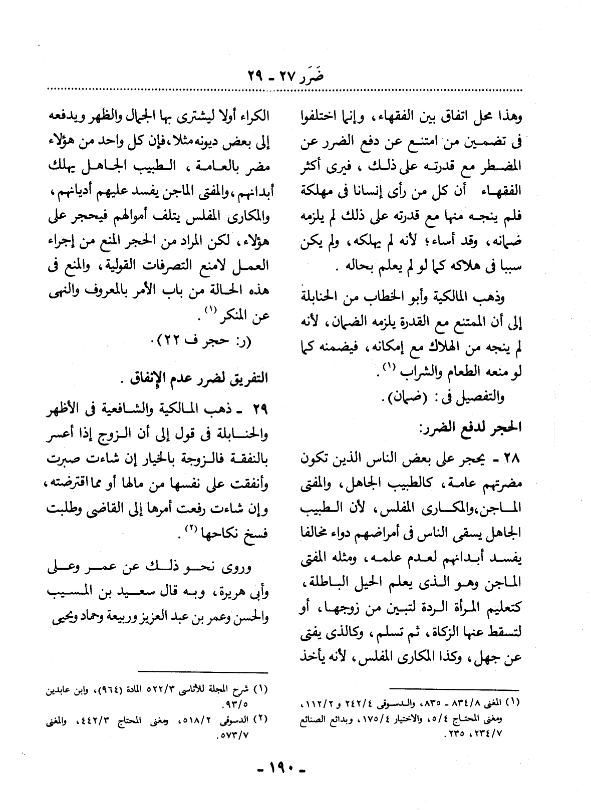 28 - يُحْجَرُ عَلَى بَعْضِ النَّاسِ الَّذِينَ تَكُونُ مَضَرَّتُهُمْ عَامَّةً، كَالطَّبِيبِ الْجَاهِل، وَالْمُفْتِي الْمَاجِنِ، وَالْمُكَارِي الْمُفْلِسِ، لأَِنَّ الطَّبِيبَ الْجَاهِل يَسْقِي النَّاسَ فِي أَمْرَاضِهِمْ دَوَاءً مُخَالِفًا يُفْسِدُ أَبْدَانَهُمْ لِعَدَمِ عِلْمِهِ، وَمِثْلُهُ الْمُفْتِي الْمَاجِنُ وَهُوَ الَّذِي يُعَلِّمُ الْحِيَل الْبَاطِلَةَ، كَتَعْلِيمِ الْمَرْأَةِ الرِّدَّةَ لِتَبِينَ مِنْ زَوْجِهَا، أَوْ لِتَسْقُطَ عَنْهَا الزَّكَاةُ، ثُمَّ تُسْلِمَ، وَكَالَّذِي يُفْتِي عَنْ جَهْلٍ، وَكَذَا الْمُكَارِي الْمُفْلِسُ، لأَِنَّهُ يَأْخُذُ