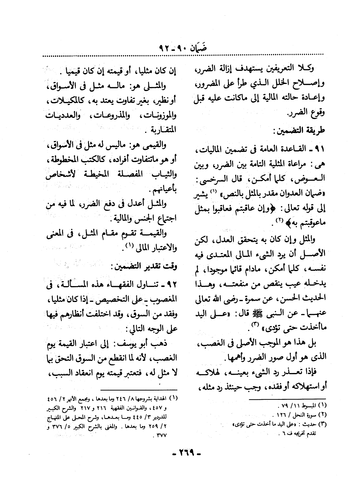 91 - الْقَاعِدَةُ الْعَامَّةُ فِي تَضْمِينِ الْمَالِيَّاتِ، هِيَ: مُرَاعَاةُ الْمِثْلِيَّةِ التَّامَّةِ بَيْنَ الضَّرَرِ، وَبَيْنَ الْعِوَضِ، كُلَّمَا أَمْكَنَ، قَال السَّرَخْسِيُّ: " ضَمَانُ الْعُدْوَانِ مُقَدَّرٌ بِالْمِثْل بِالنَّصِّ (1) " يُشِيرُ إِلَى قَوْله تَعَالَى: {وَإِنْ عَاقَبْتُمْ فَعَاقِبُوا بِمِثْل مَا عُوقِبْتُمْ بِهِ (2) } .