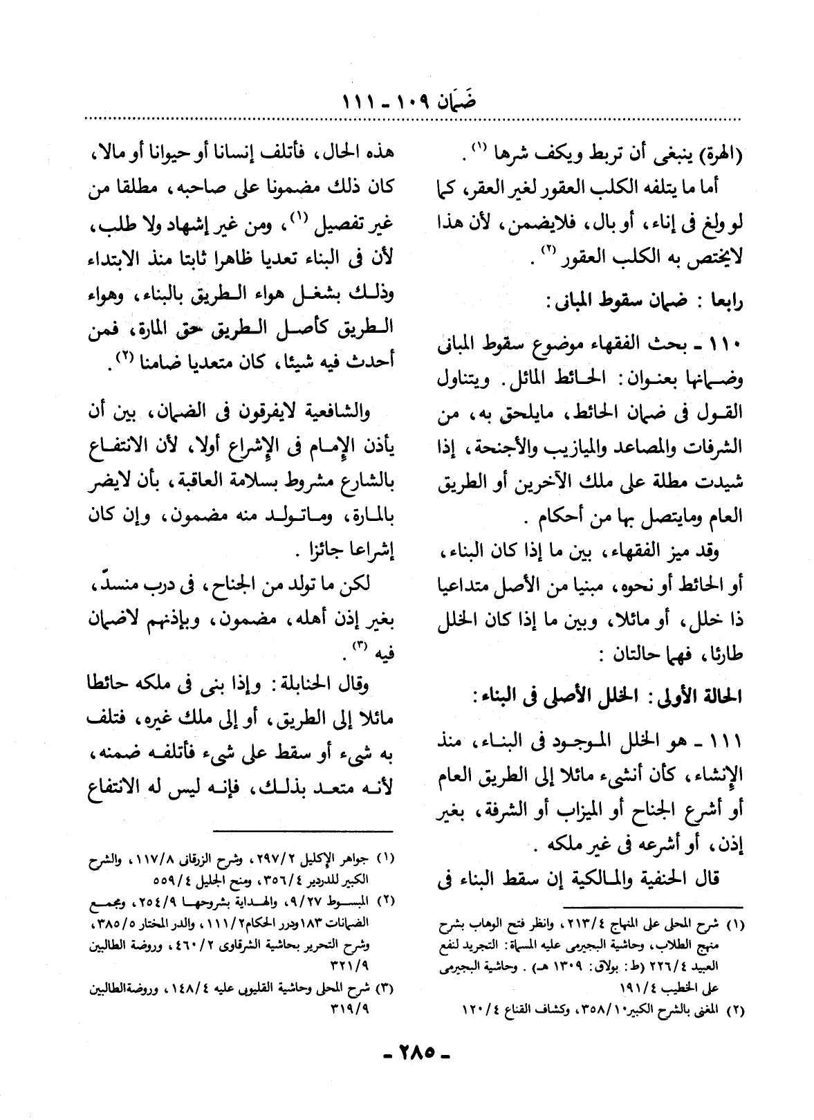 110 - بَحَثَ الْفُقَهَاءُ مَوْضُوعَ سُقُوطِ الْمَبَانِي وَضَمَانَهَا بِعِنْوَانِ: الْحَائِطِ الْمَائِل. وَيَتَنَاوَل الْقَوْل فِي ضَمَانِ الْحَائِطِ، مَا يَلْحَقُ بِهِ، مِنَ الشُّرُفَاتِ وَالْمَصَاعِدِ وَالْمَيَازِيبِ وَالأَْجْنِحَةِ، إِذَا شُيِّدَتْ مُطِلَّةً عَلَى مِلْكِ الآْخَرِينَ أَوِ الطَّرِيقِ الْعَامِّ وَمَا يَتَّصِل بِهَا مِنْ أَحْكَامٍ.