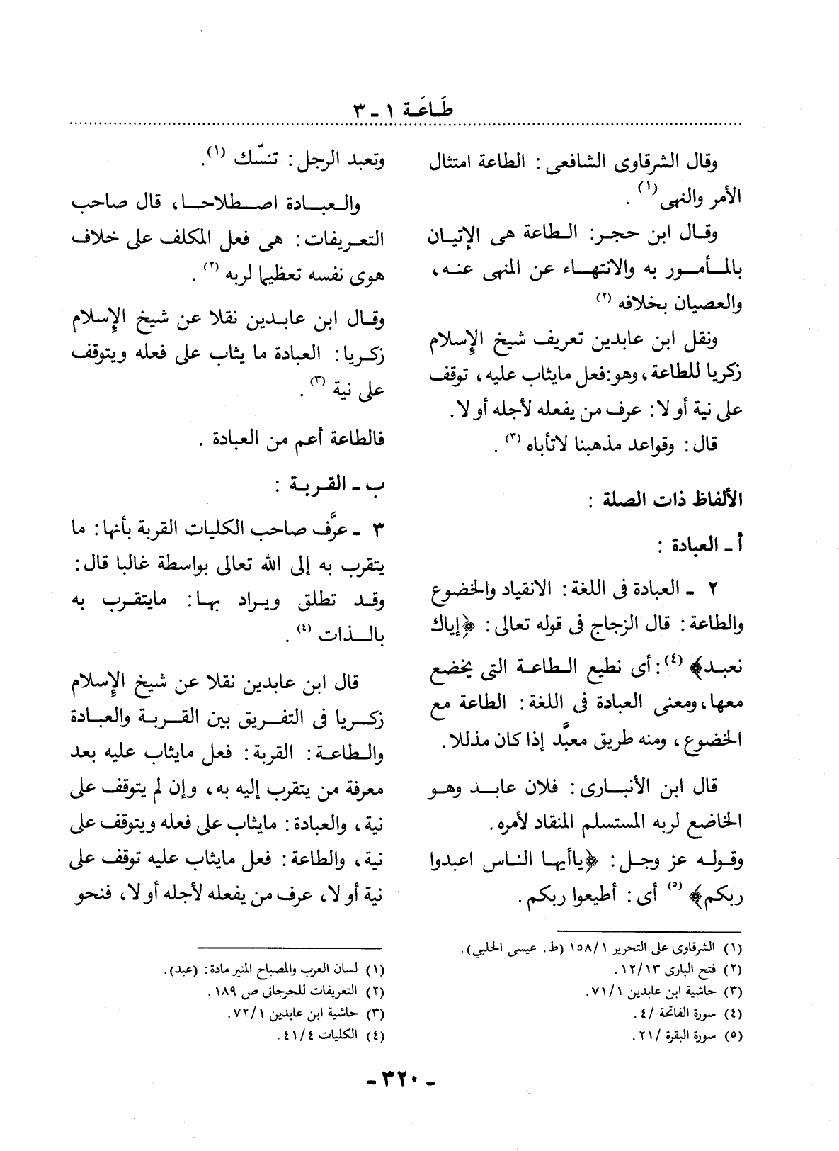 (2) وَنَقَل ابْنُ عَابِدِينَ تَعْرِيفَ شَيْخِ الإِْسْلاَمِ زَكَرِيَّا لِلطَّاعَةِ، وَهُوَ: فِعْل مَا يُثَابُ عَلَيْهِ، تَوَقَّفَ عَلَى نِيَّةٍ أَوْ لاَ عَرَفَ مَنْ يَفْعَلُهُ لأَِجْلِهِ أَوْ لاَ.