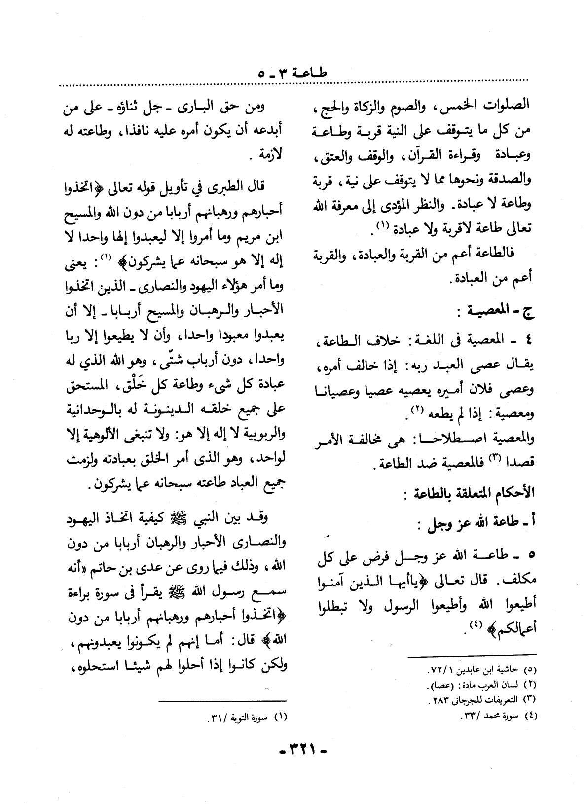 5 - طَاعَةُ اللَّهِ عَزَّ وَجَل فَرْضٌ عَلَى كُل مُكَلَّفٍ. قَال تَعَالَى {يَا أَيُّهَا الَّذِينَ آمَنُوا أَطِيعُوا اللَّهَ وَأَطِيعُوا الرَّسُول وَلاَ تُبْطِلُوا أَعْمَالَكُمْ} (4) .