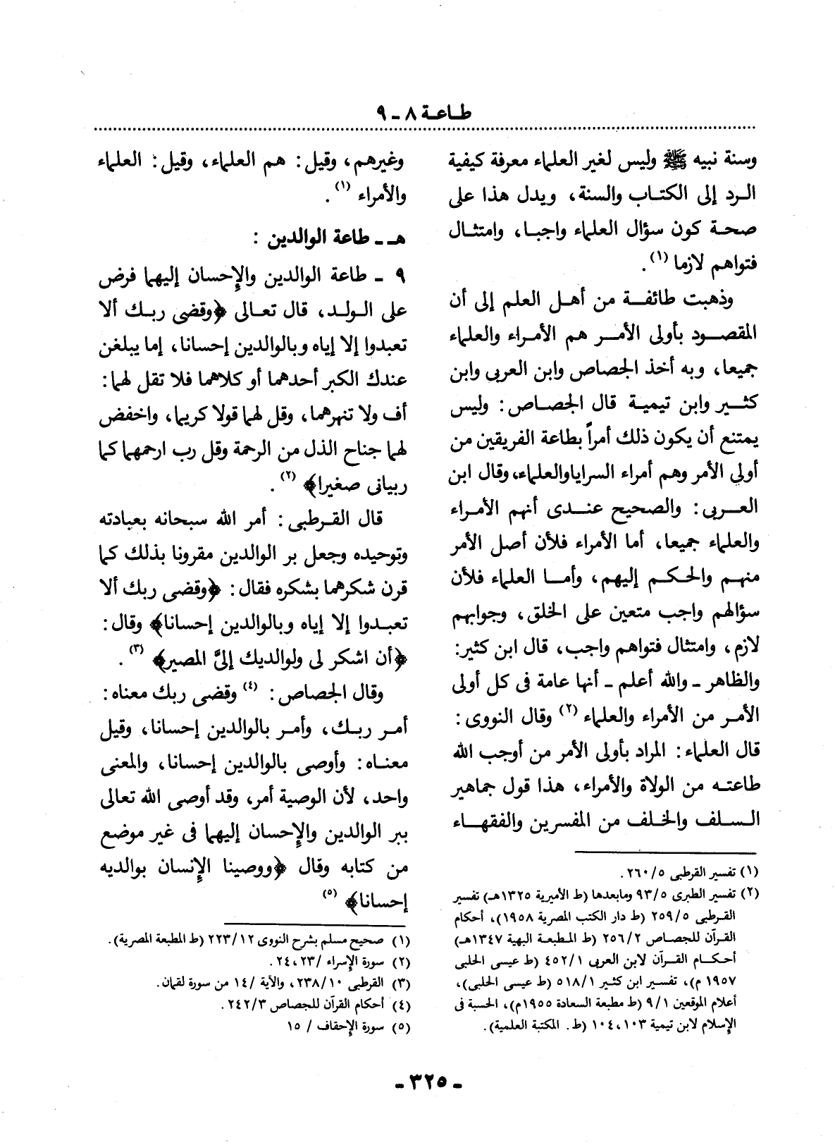 9 - طَاعَةُ الْوَالِدَيْنِ وَالإِْحْسَانُ إِلَيْهِمَا فَرْضٌ عَلَى الْوَلَدِ، قَال تَعَالَى {وَقَضَى رَبُّكَ أَلاَّ تَعْبُدُوا إِلاَّ إِيَّاهُ وَبِالْوَالِدَيْنِ إِحْسَانًا إِمَّا يَبْلُغَنَّ عِنْدَكَ الْكِبَرَ أَحَدُهُمَا أَوْ كِلاَهُمَا فَلاَ تَقُل لَهُمَا أُفٍّ وَلاَ تَنْهَرْهُمَا وَقُل لَهُمَا قَوْلاً كَرِيمًا وَاخْفِضْ لَهُمَا جَنَاحَ الذُّل مِنَ الرَّحْمَةِ وَقُل رَبِّ ارْحَمْهُمَا كَمَا رَبَّيَانِي صَغِيرًا} (2) .