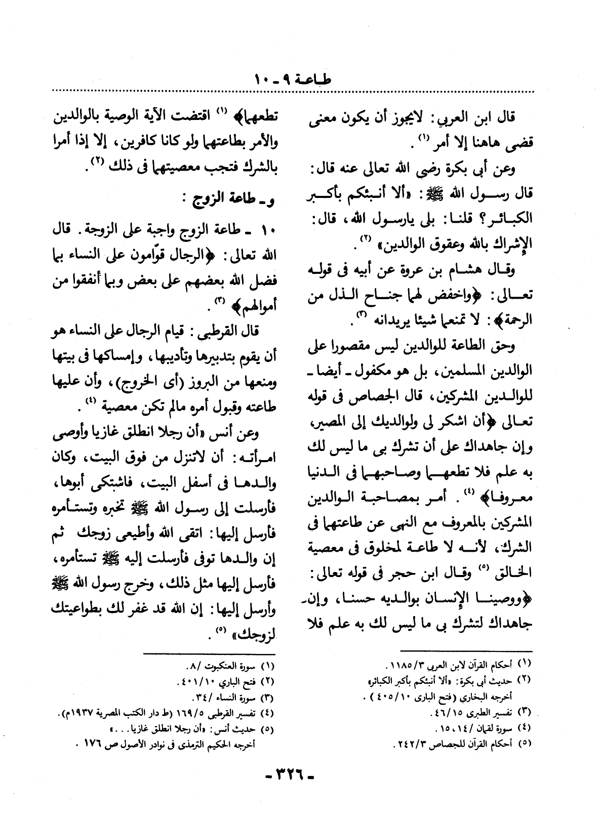 10 - طَاعَةُ الزَّوْجِ وَاجِبَةٌ عَلَى الزَّوْجَةِ. قَال اللَّهُ تَعَالَى: {الرِّجَال قَوَّامُونَ عَلَى النِّسَاءِ بِمَا فَضَّل اللَّهُ بَعْضَهُمْ عَلَى بَعْضٍ وَبِمَا أَنْفَقُوا مِنْ أَمْوَالِهِمْ} (3) .
