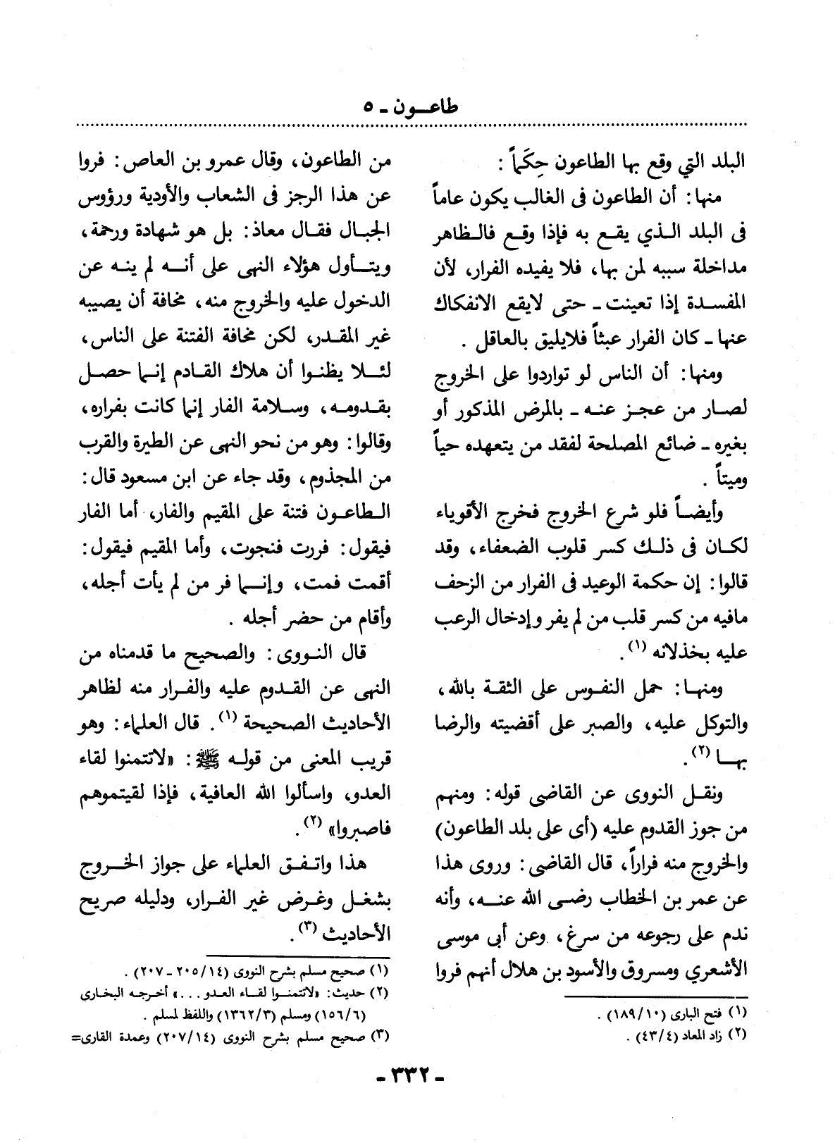مِنَ الطَّاعُونِ، وَقَال عَمْرُو بْنُ الْعَاصِ: فِرُّوا عَنْ هَذَا الرِّجْزِ فِي الشِّعَابِ وَالأَْوْدِيَةِ وَرُءُوسِ الْجِبَال فَقَال مُعَاذٌ: بَل هُوَ شَهَادَةٌ وَرَحْمَةٌ، وَيَتَأَوَّل هَؤُلاَءِ النَّهْيَ عَلَى أَنَّهُ لَمْ يَنْهَ عَنِ الدُّخُول عَلَيْهِ وَالْخُرُوجِ مِنْهُ، مَخَافَةَ أَنْ يُصِيبَهُ غَيْرُ الْمُقَدَّرِ، لَكِنْ مَخَافَةَ الْفِتْنَةِ عَلَى النَّاسِ، لِئَلاَّ يَظُنُّوا أَنَّ هَلاَكَ الْقَادِمِ إِنَّمَا حَصَل بِقُدُومِهِ، وَسَلاَمَةُ الْفَارِّ إِنَّمَا كَانَتْ بِفِرَارِهِ، وَقَالُوا: وَهُوَ مِنْ نَحْوِ النَّهْيِ عَنِ الطِّيَرَةِ وَالْقُرْبِ مِنَ الْمَجْذُومِ، وَقَدْ جَاءَ عَنِ ابْنِ مَسْعُودٍ قَال: الطَّاعُونُ فِتْنَةٌ عَلَى الْمُقِيمِ وَالْفَارِّ، أَمَّا الْفَارُّ فَيَقُول: فَرَرْتُ فَنَجَوْتُ، وَأَمَّا الْمُقِيمُ فَيَقُول: أَقَمْتُ فَمُتُّ، وَإِنَّمَا فَرَّ مَنْ لَمْ يَأْتِ أَجَلُهُ، وَأَقَامَ مَنْ حَضَرَ أَجَلُهُ.