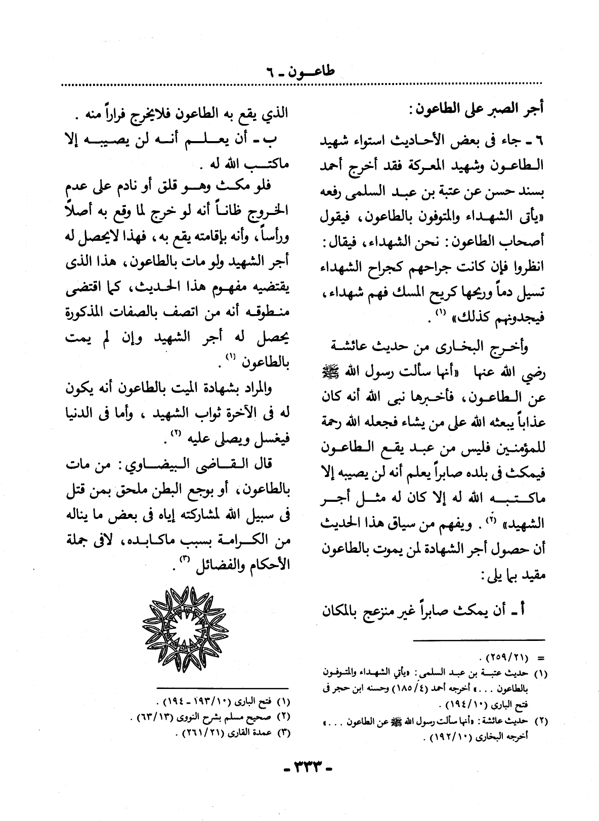 (1) حديث عتبة بن عبد السلمي: " يأتي الشهداء والمتوفون بالطاعون. . . " أخرجه أحمد (4 / 185) ، وحسنه ابن حجر في فتح الباري (10 / 194) .