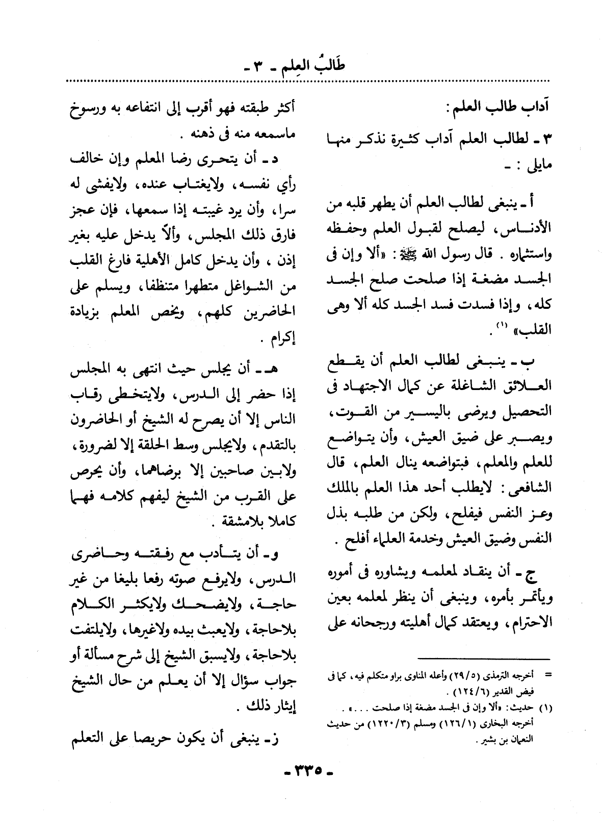 3 - لِطَالِبِ الْعِلْمِ آدَابٌ كَثِيرَةٌ نَذْكُرُ مِنْهَا مَا يَلِي: - أ - يَنْبَغِي لِطَالِبِ الْعِلْمِ أَنْ يُطَهِّرَ قَلْبَهُ مِنَ الأَْدْنَاسِ، لِيَصْلُحَ لِقَبُول الْعِلْمِ وَحِفْظِهِ وَاسْتِثْمَارِهِ. قَال رَسُول اللَّهِ صَلَّى اللَّهُ عَلَيْهِ وَسَلَّمَ: أَلاَ وَإِنَّ فِي الْجَسَدِ مُضْغَةً إِذَا صَلَحَتْ صَلَحَ الْجَسَدُ كُلُّهُ، وَإِذَا فَسَدَتْ فَسَدَ الْجَسَدُ كُلُّهُ أَلاَ وَهِيَ الْقَلْبُ (1) .