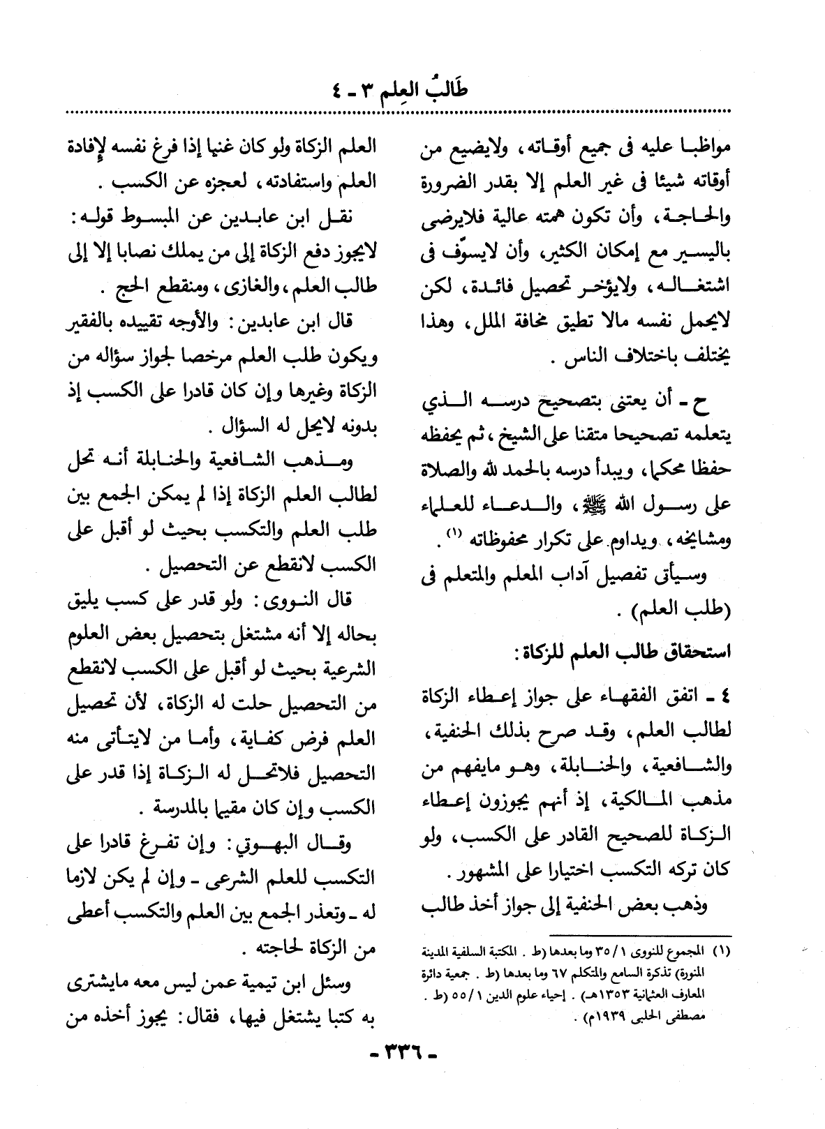 (1) المجموع للنووي 1 / 35 وما بعدها (ط. المكتبة السلفية المدينة المنورة) تذكرة السامع والمتكلم 67 وما بعدها (ط. جمعية دائرة المعارف العثمانية 1353 هـ) ، إحياء علوم الدين 1 / 55 (ط. مصطفى الحلبي 1939 م) .