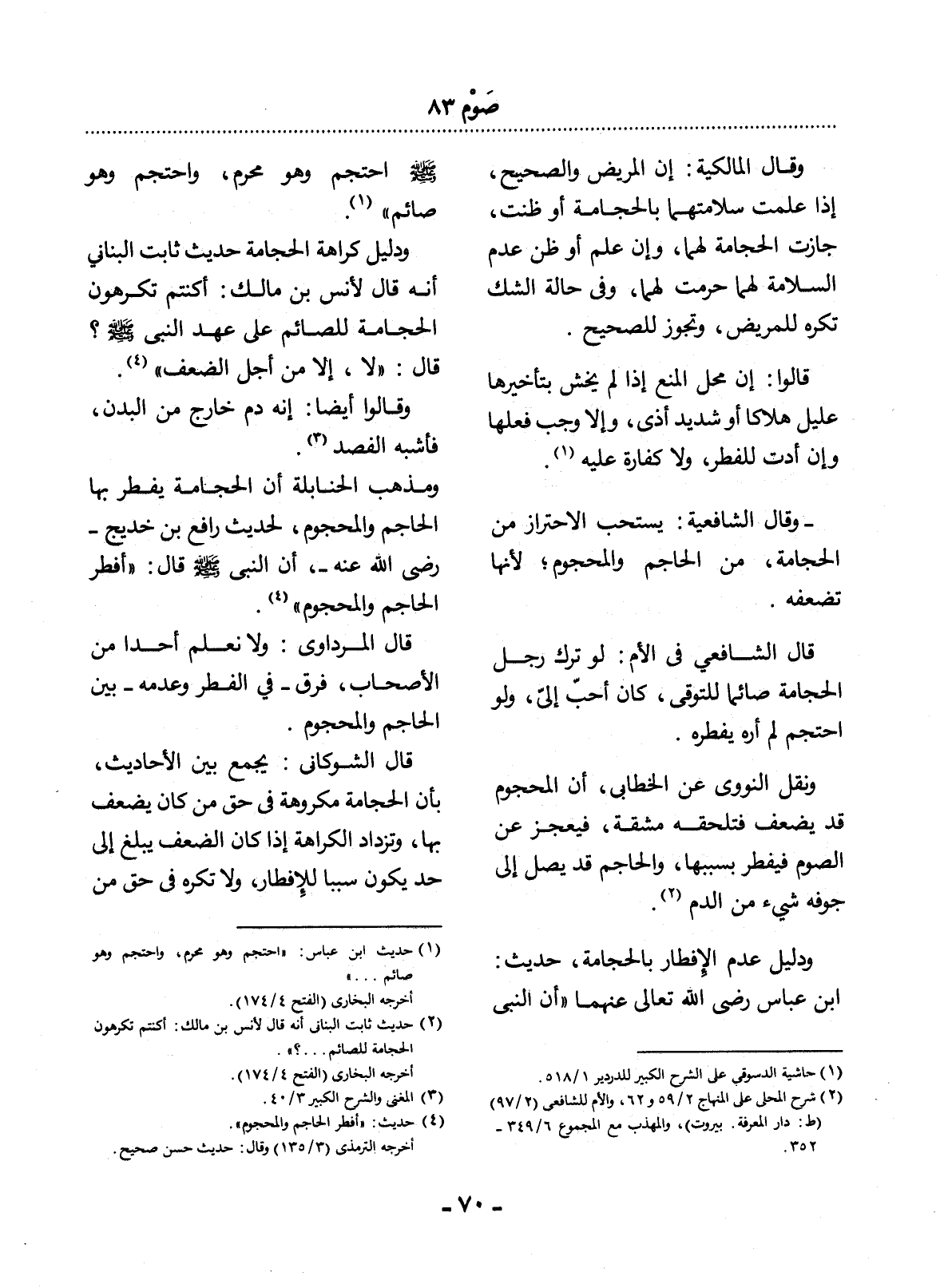 (1) حديث ابن عباس: " احتجم وهو محرم، واحتجم وهو صائم. . . ". أخرجه البخاري (الفتح 4 / 174) .