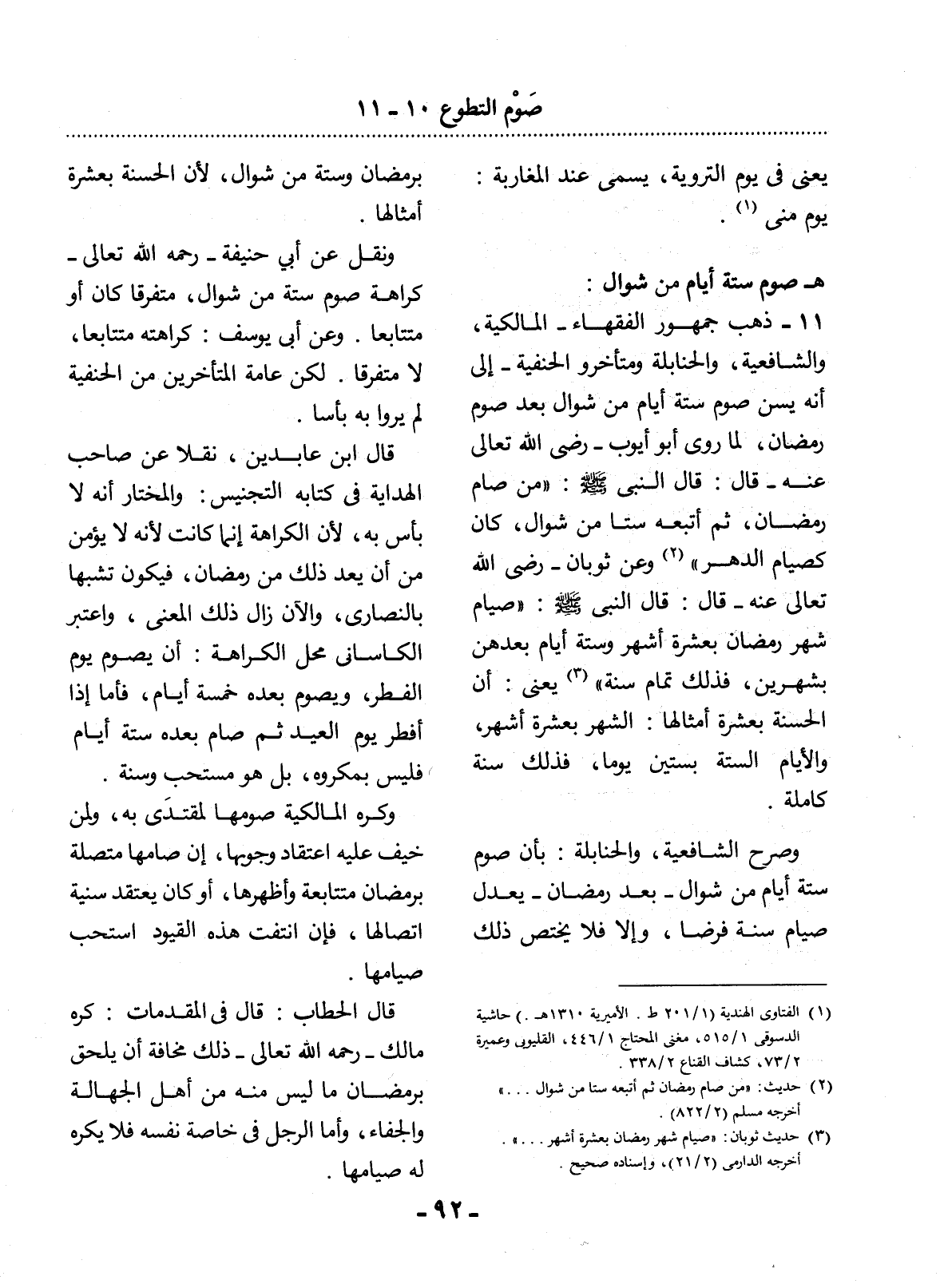 11 - ذَهَبَ جُمْهُورُ الْفُقَهَاءِ - الْمَالِكِيَّةُ، وَالشَّافِعِيَّةُ، وَالْحَنَابِلَةُ وَمُتَأَخِّرُو الْحَنَفِيَّةِ - إِلَى أَنَّهُ يُسَنُّ صَوْمُ سِتَّةِ أَيَّامٍ مِنْ شَوَّالٍ بَعْدَ صَوْمِ رَمَضَانَ، لِمَا رَوَى أَبُو أَيُّوبَ - رَضِيَ اللَّهُ تَعَالَى عَنْهُ - قَال: قَال النَّبِيُّ صَلَّى اللَّهُ عَلَيْهِ وَسَلَّمَ: مَنْ صَامَ رَمَضَانَ، ثُمَّ أَتْبَعَهُ سِتًّا مِنْ شَوَّالٍ، كَانَ كَصِيَامِ الدَّهْرِ (2) وَعَنْ ثَوْبَانَ - رَضِيَ اللَّهُ تَعَالَى عَنْهُ - قَال: قَال النَّبِيُّ صَلَّى اللَّهُ عَلَيْهِ وَسَلَّمَ: صِيَامُ شَهْرِ رَمَضَانَ بِعَشْرَةِ أَشْهُرٍ وَسِتَّةُ أَيَّامٍ بَعْدَهُنَّ بِشَهْرَيْنِ، فَذَلِكَ تَمَامُ سَنَةٍ (3) يَعْنِي: أَنَّ الْحَسَنَةَ بِعَشَرَةِ أَمْثَالِهَا، الشَّهْرُ بِعَشَرَةِ أَشْهُرٍ، وَالأَْيَّامُ السِّتَّةُ بِسِتِّينَ يَوْمًا، فَذَلِكَ سَنَةٌ كَامِلَةٌ.