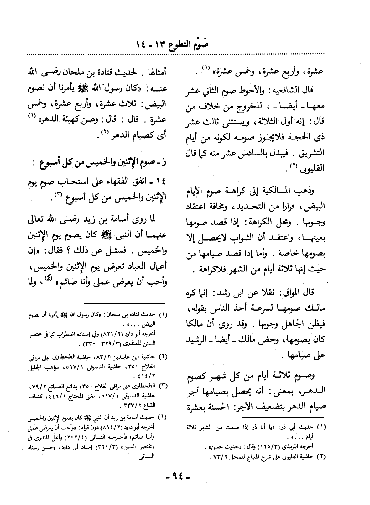 (1) حديث قتادة بن ملحان: " كان رسول الله صلى الله عليه وسلم يأمرنا أن نصوم البيض. . . ". أخرجه أبو داود (2 / 821) وفي إسناده اضطراب كما في مختصر السنن للمنذري (3 / 329 - 330) .