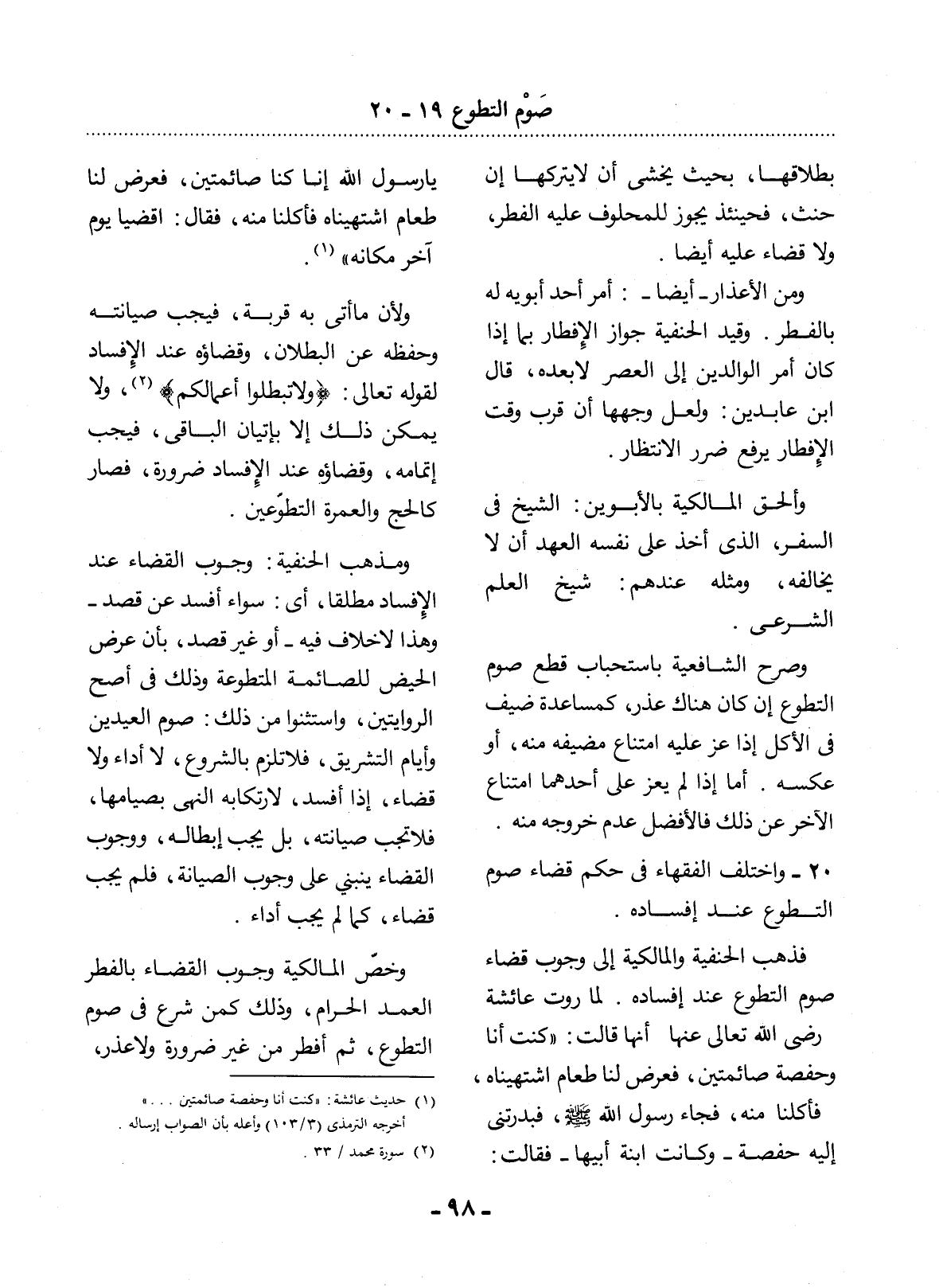 وَلأَِنَّ مَا أَتَى بِهِ قُرْبَةٌ، فَيَجِبُ صِيَانَتُهُ وَحِفْظُهُ عَنِ الْبُطْلاَنِ، وَقَضَاؤُهُ عِنْدَ الإِْفْسَادِ لِقَوْلِهِ تَعَالَى: {وَلاَ تُبْطِلُوا أَعْمَالَكُمْ} (2) ، وَلاَ يُمْكِنُ ذَلِكَ إِلاَّ بِإِتْيَانِ الْبَاقِي، فَيَجِبُ إِتْمَامُهُ وَقَضَاؤُهُ عِنْدَ الإِْفْسَادِ ضَرُورَةً، فَصَارَ كَالْحَجِّ وَالْعُمْرَةِ التَّطَوُّعَيْنِ.