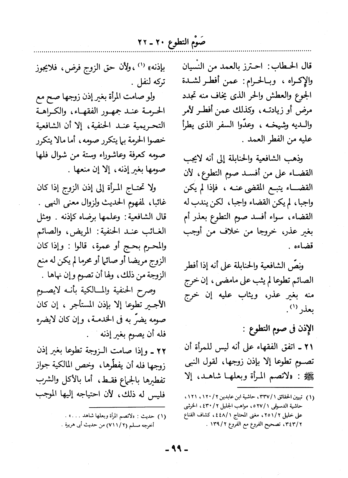 21 - اتَّفَقَ الْفُقَهَاءُ عَلَى أَنَّهُ لَيْسَ لِلْمَرْأَةِ أَنْ تَصُومَ تَطَوُّعًا إِلاَّ بِإِذْنِ زَوْجِهَا، لِقَوْل النَّبِيِّ صَلَّى اللَّهُ عَلَيْهِ وَسَلَّمَ: لاَ تَصُمِ الْمَرْأَةُ وَبَعْلُهَا شَاهِدٌ، إِلاَّ