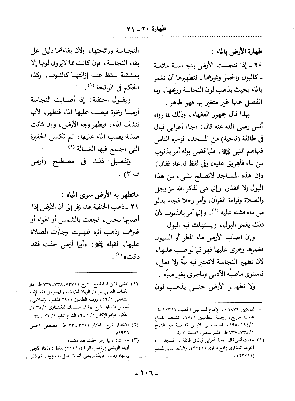 20 - إِذَا تَنَجَّسَتْ الأَْرْضُ بِنَجَاسَةٍ مَائِعَةٍ - كَالْبَوْل وَالْخَمْرِ وَغَيْرِهِمَا - فَتَطْهِيرُهَا أَنْ تُغْمَرَ بِالْمَاءِ بِحَيْثُ يَذْهَبُ لَوْنُ النَّجَاسَةِ وَرِيحُهَا، وَمَا انْفَصَل عَنْهَا غَيْرُ مُتَغَيِّرٍ بِهَا فَهُوَ طَاهِرٌ.